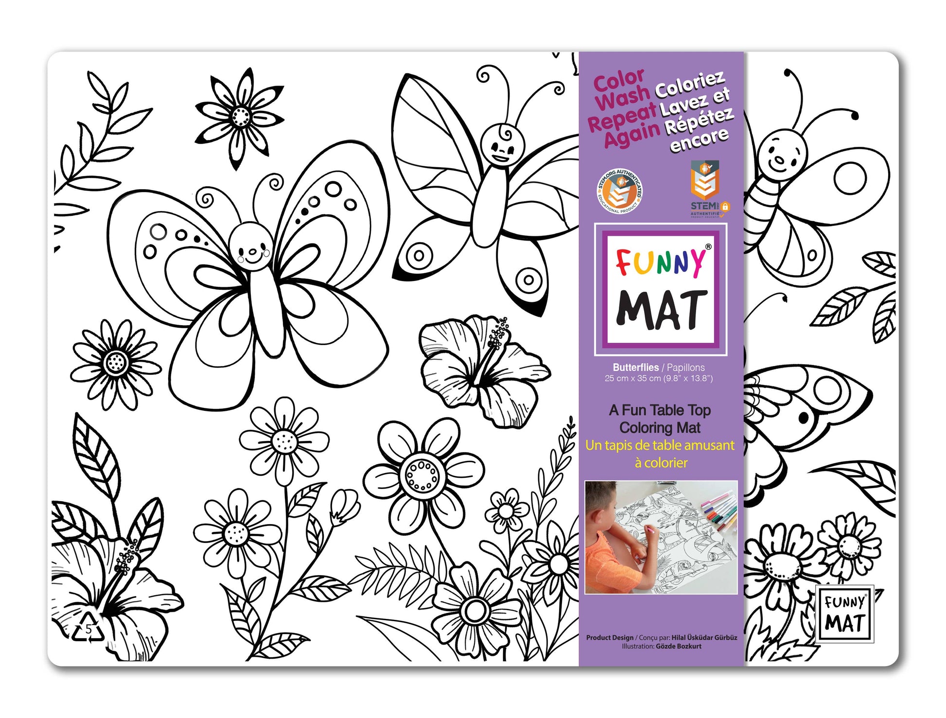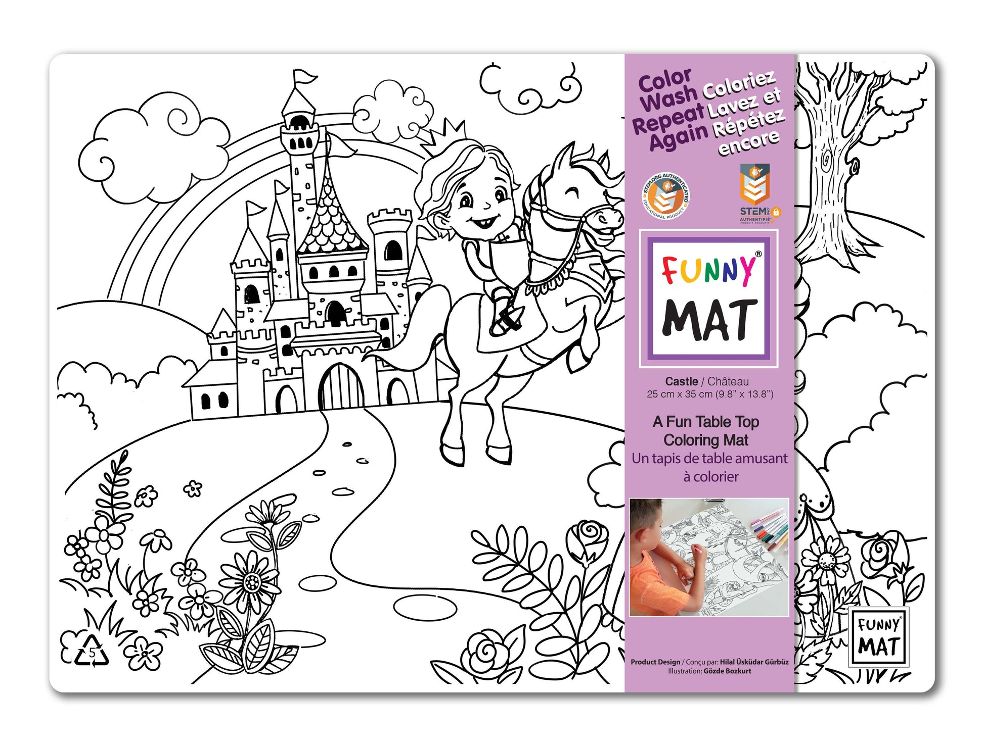 Funny Mat is a table top cover that can be used for craft projects such as drawing, coloring or as a protective mat for painting, plasticine and play dough or as a placemat. The designs on Funny Mat can be colored with water-based, washable markers. Funny Mat is made of polyproylene and is recyclable and reusable. Each mat size is 25 x 35 cm (9.8" x 13.8"). Set includes compact size mats with butterfly and castle designs with 6 Giotto markers in assorted colors.