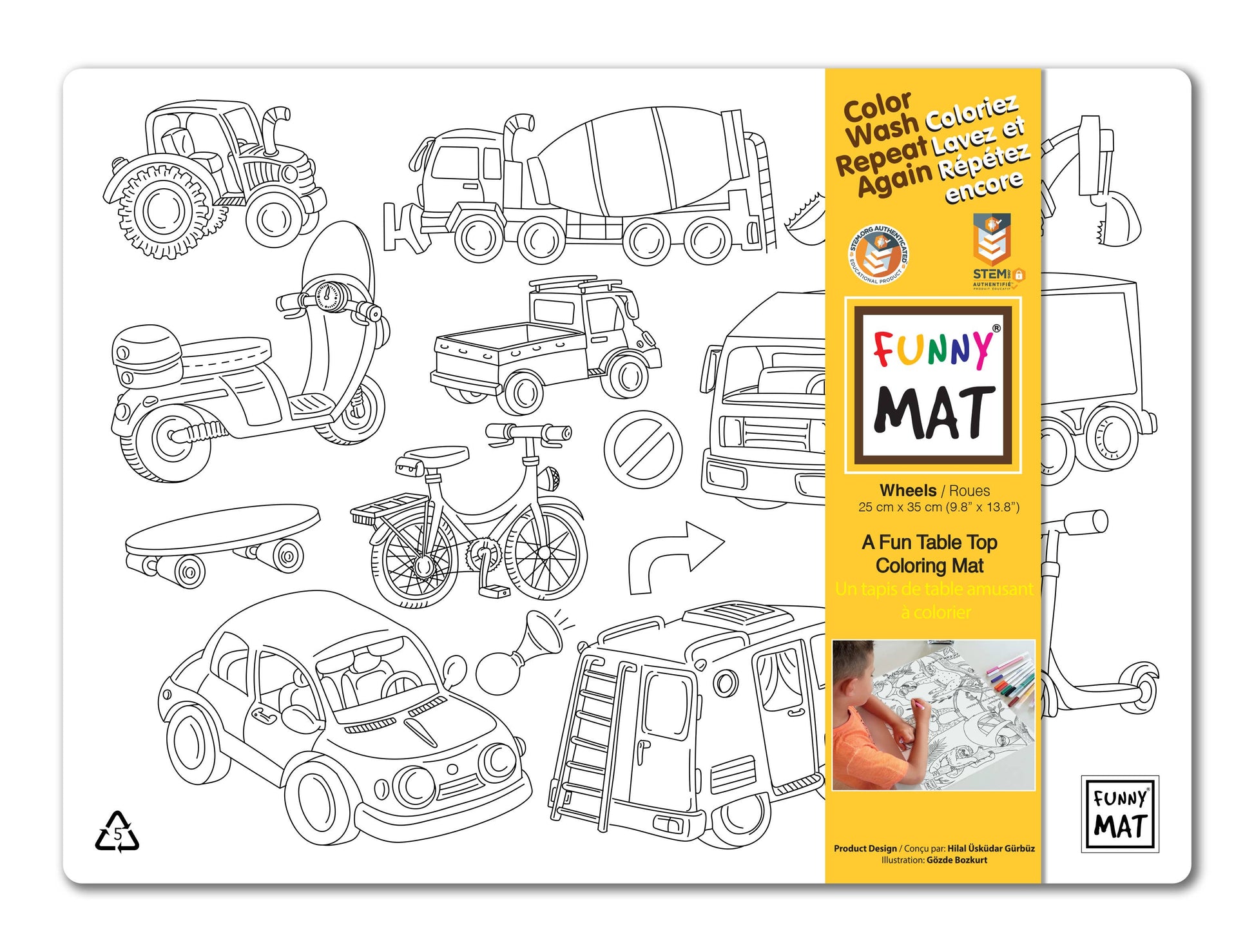 Funny Mat is a table top cover that can be used for craft projects such as drawing, coloring or as a protective mat for painting, plasticine and play dough or as a placemat. The designs on Funny Mat can be colored with water-based, washable markers. Funny Mat is made of polyproylene and is recyclable and reusable.
