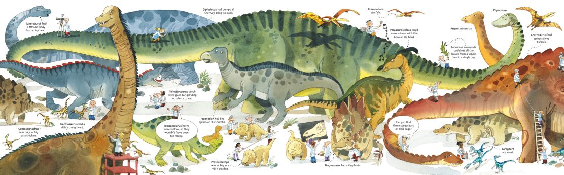 Each page has either two giant folding flaps, to reveal more dinosaurs underneath, or a 4-page concertina-fold pull-out, to reveal the very LONGEST creatures, on land and under the sea.