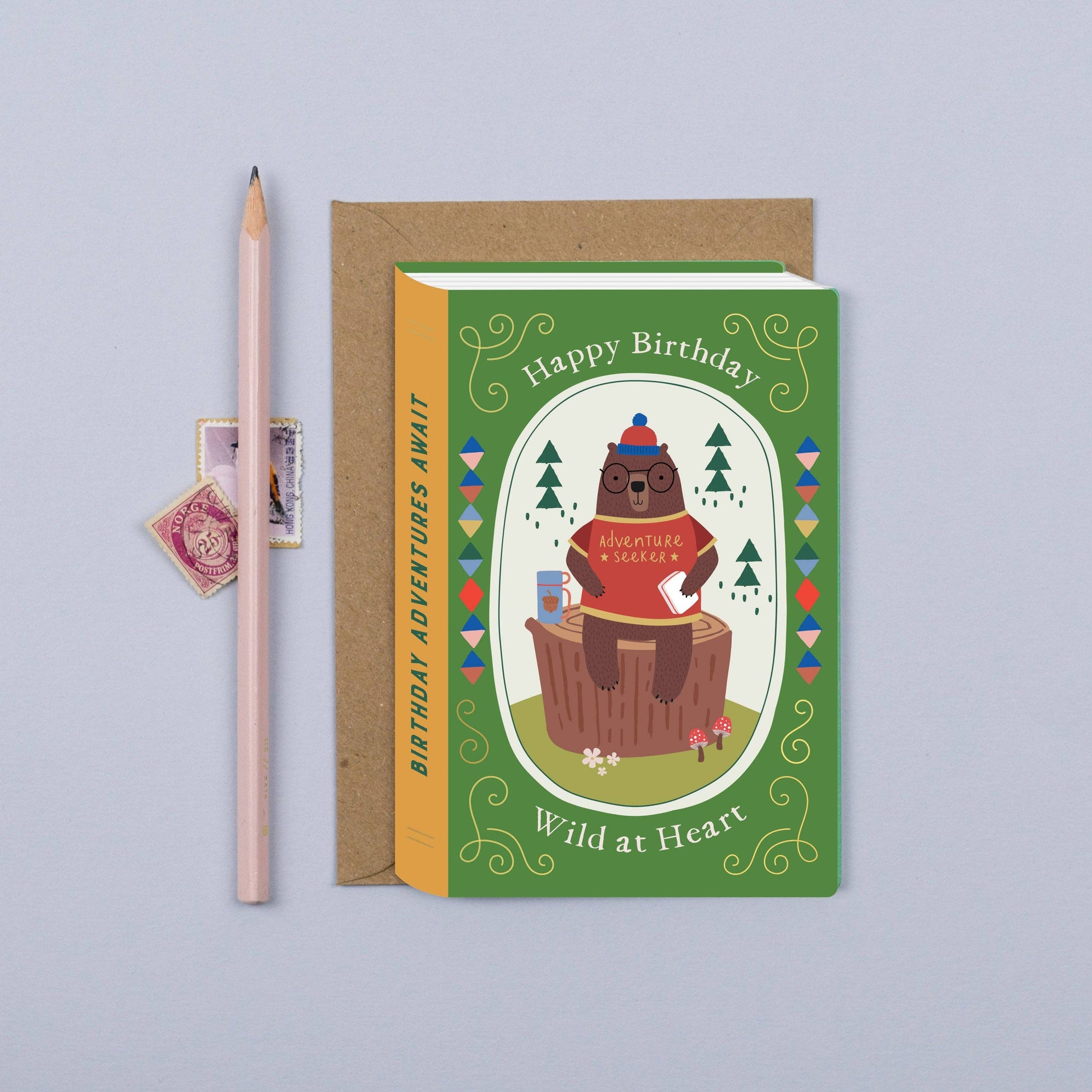 Celebrate the adventurous spirit of your loved one's birthday with our charming Birthday Card, cleverly shaped like a book and featuring a delightful scene against a lush green background.