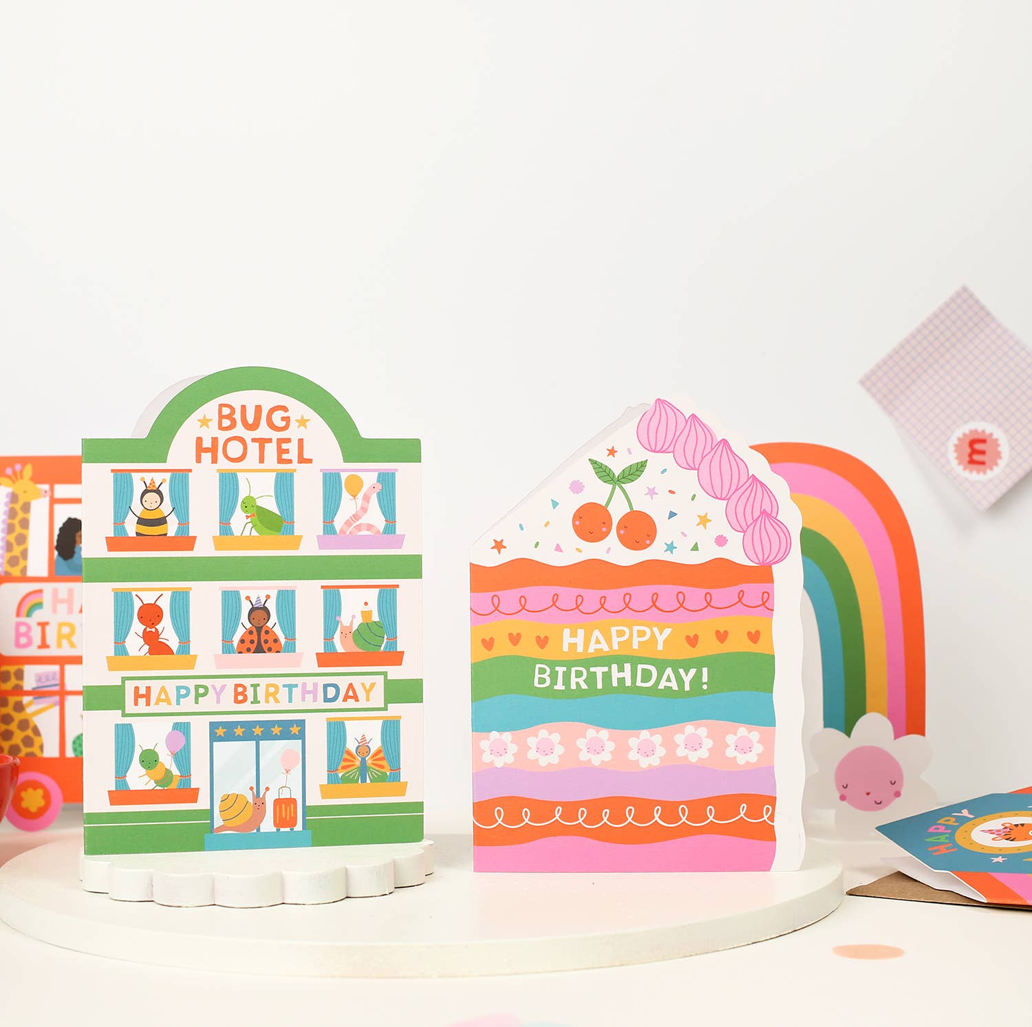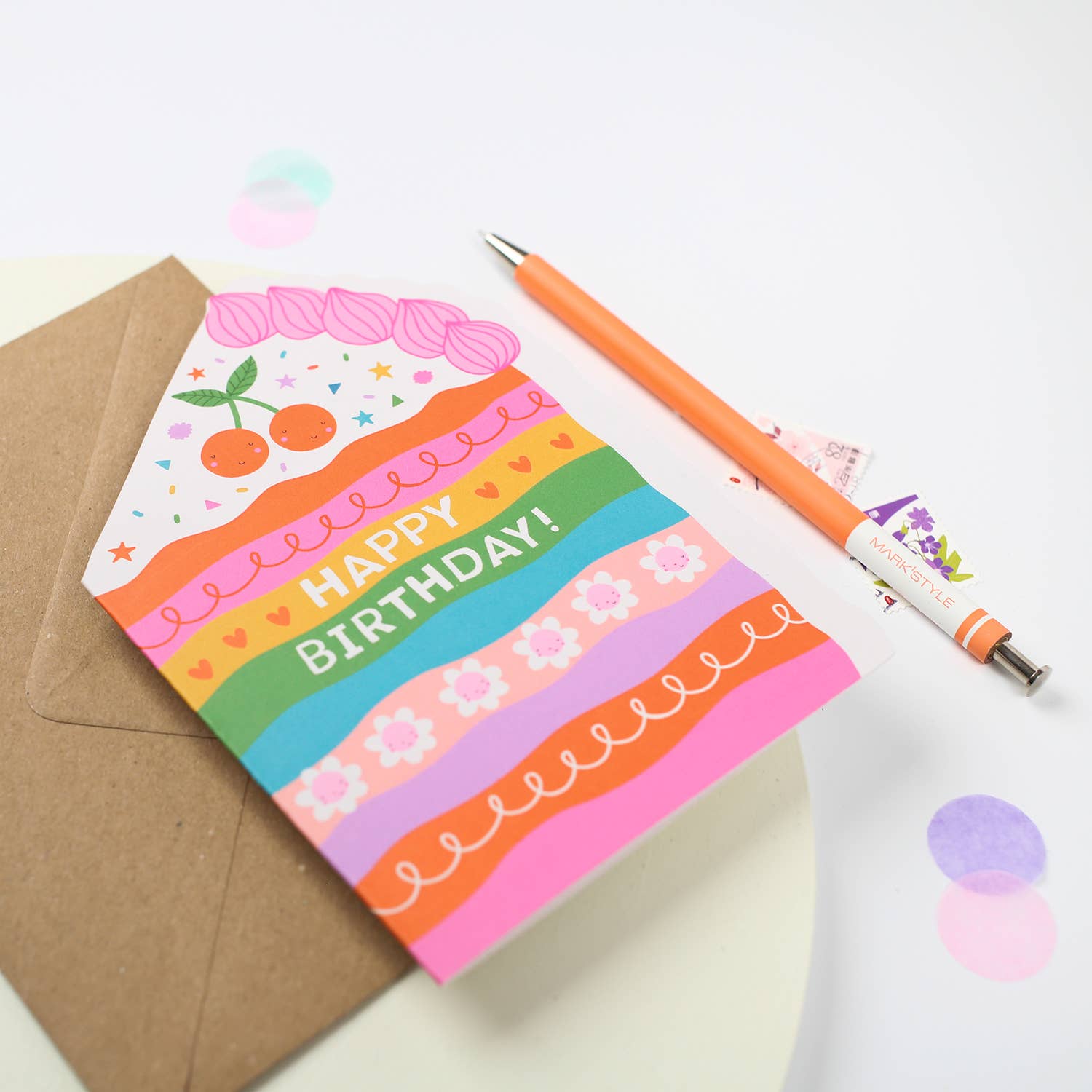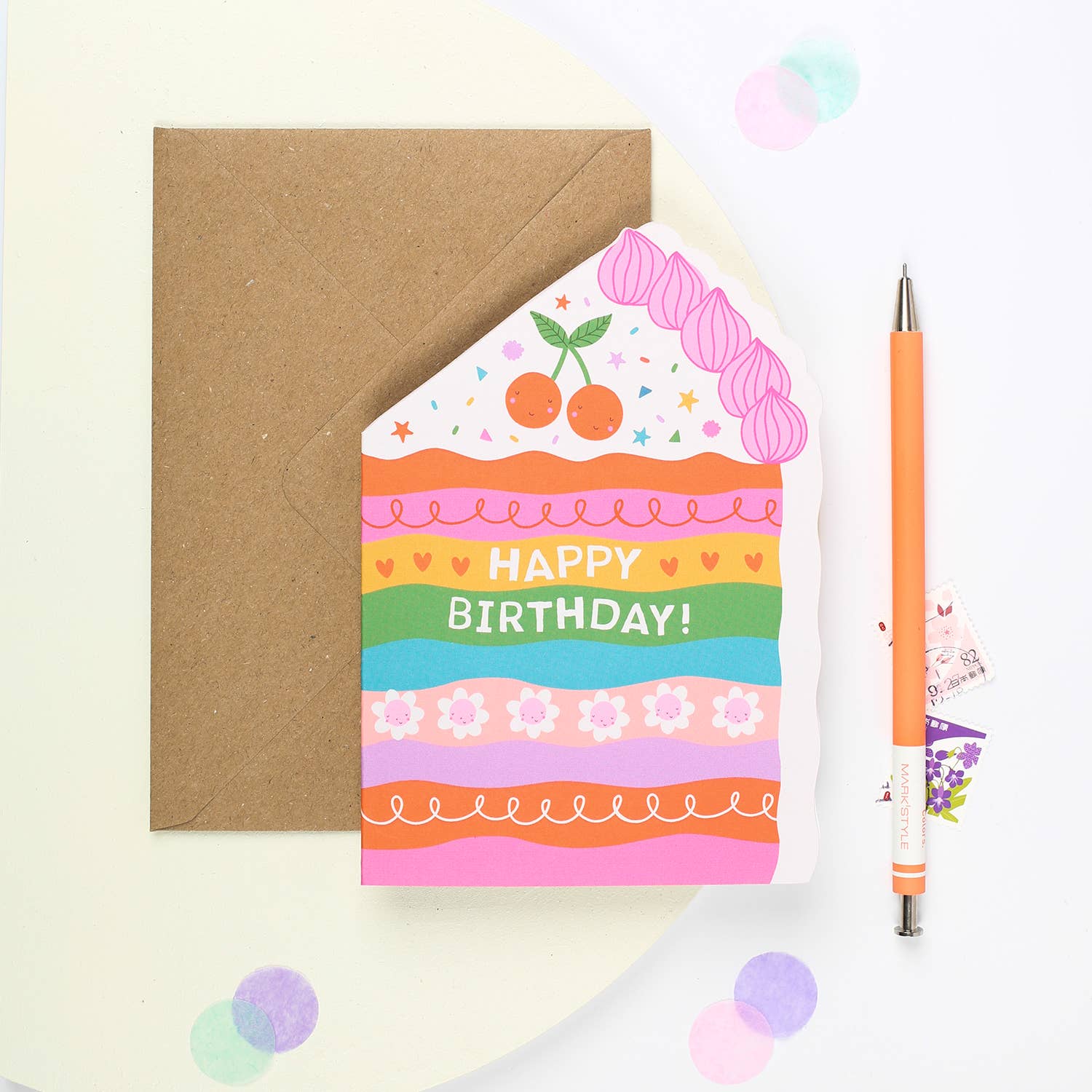Who would like a slice of cake!!? This unique, shaped birthday card is shaped into a slice of rainbow birthday cake, complete with lots of sprinkles, hearts, flowers and a sweet cherry on top! Illustrated with bright colours, the caption reads 'Happy Birthday' and is die cut for an extra special bit of magic. This luxury card was designed and made in the UK .
