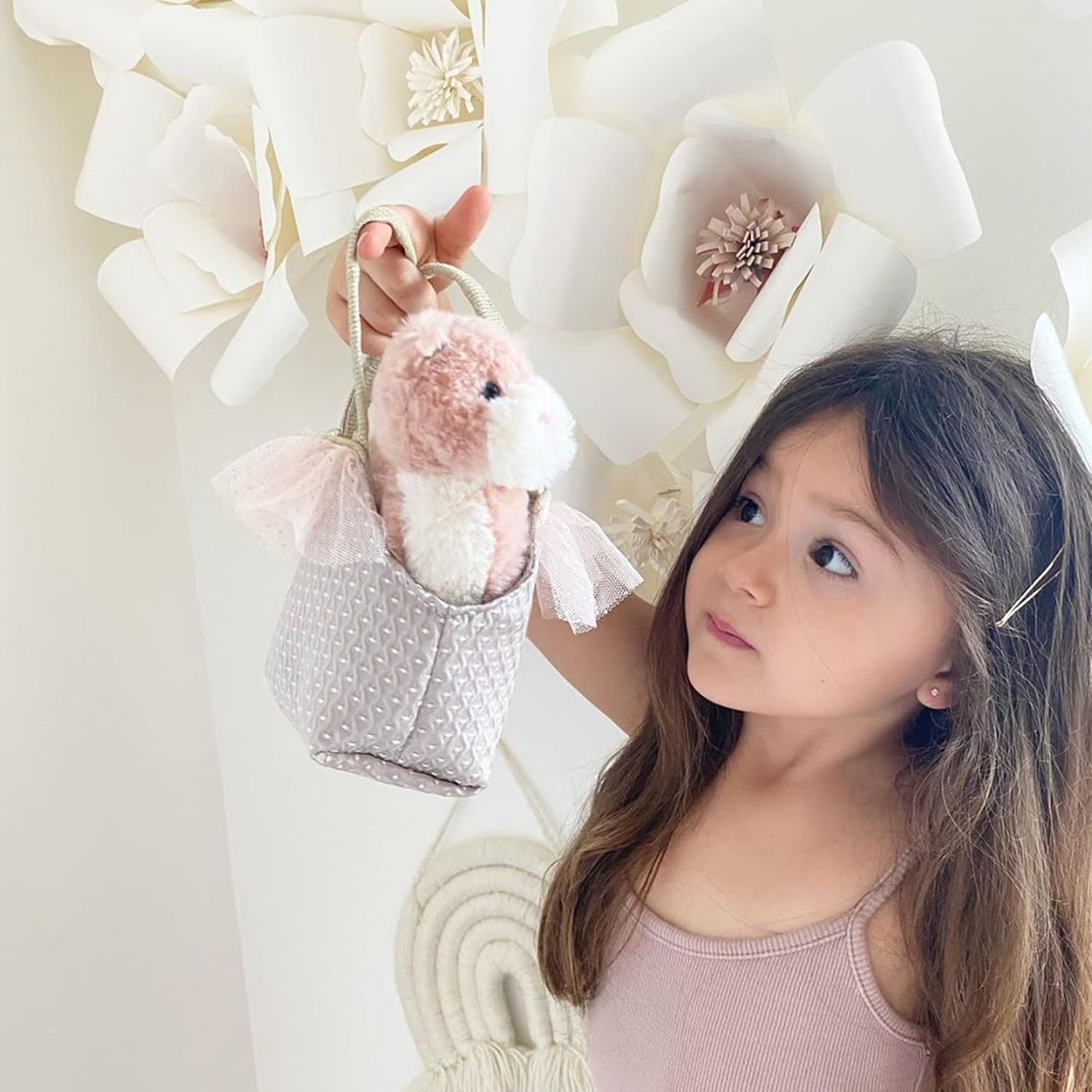 Tote around your pet bestie in their very own pretty toy purse! A mini sized Callie the kitty in a beautiful novels satin bag, trimmed in soft pink tulle and gold handle.