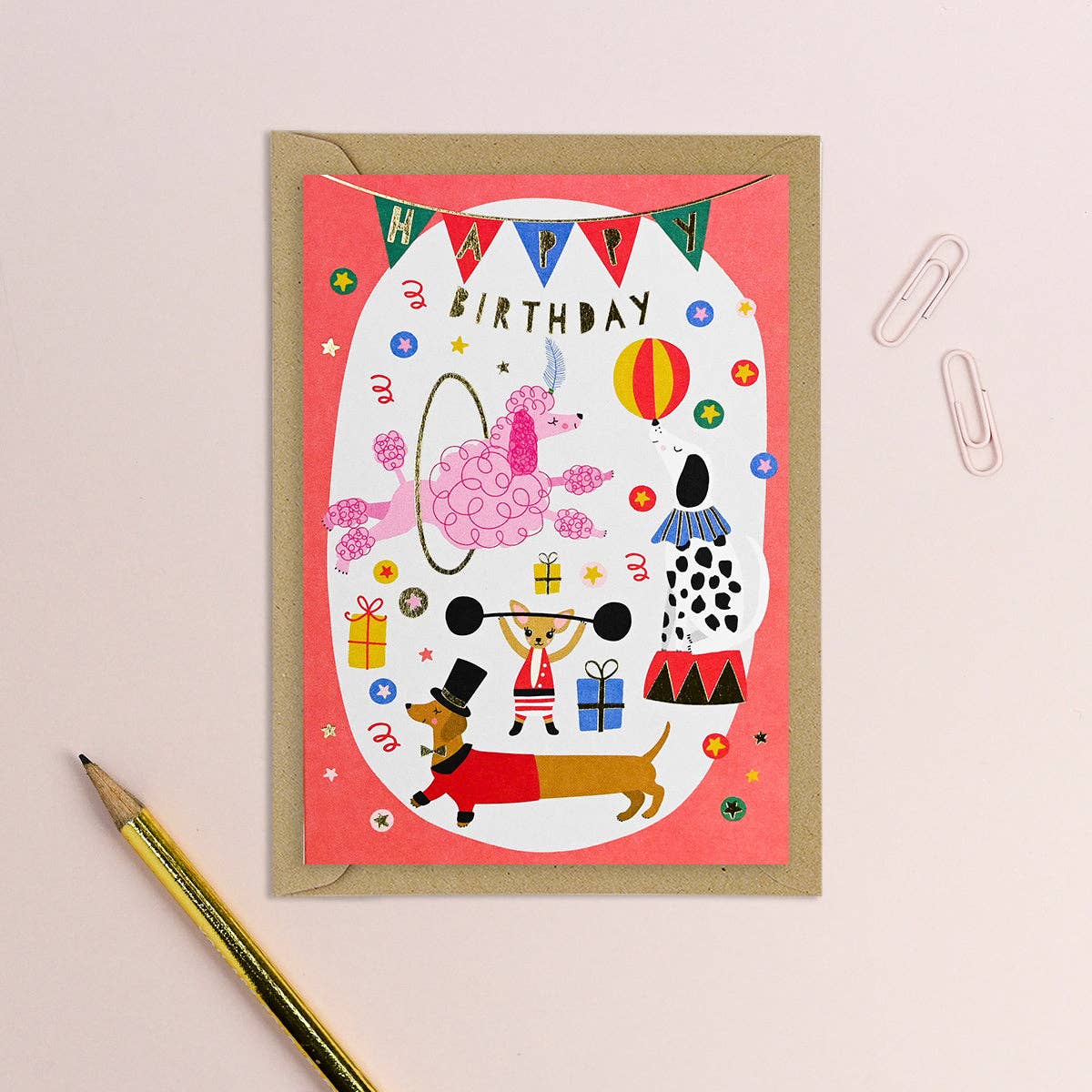 This kids birthday card features a bright and fun design featuring different dogs performing circus tricks. From a strongman chihuahua to a ringmaster dachshund, the perfect birthday card to send your favourite dog fan! This gender-neutral birthday card design is for children of all ages, complete with a little luxury in its gold foil finish.