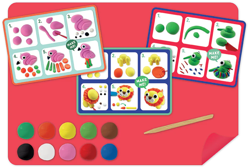 Become a master sculptor and creative genius with Clay & Play! Each set comes with 6 pots of 10 different air dry clay colours, 5 double-sided instruction cards (taking you step-by-step through the creative process), a brightly coloured silicone mat and a handy wooden stylus tool for crafting.