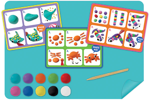 Become a master sculptor and creative genius with Clay & Play! Each set comes with 6 pots of 10 different air dry clay colours, 5 double-sided instruction cards (taking you step-by-step through the creative process), a brightly coloured silicone mat and a handy wooden stylus tool for crafting.