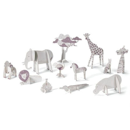 A creative kit with a multitude of cardboard pieces to colour and assemble to create animals and scenery from the savannah. The child plays with all the elements he or she makes and it's the start of fabulous stories!