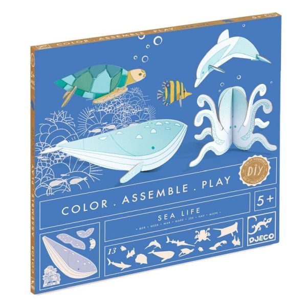 A creative kit with a multitude of cardboard pieces to be coloured and assembled to make marine animals and scenery. The child plays with all the elements he or she makes and it's the start of fabulous stories!