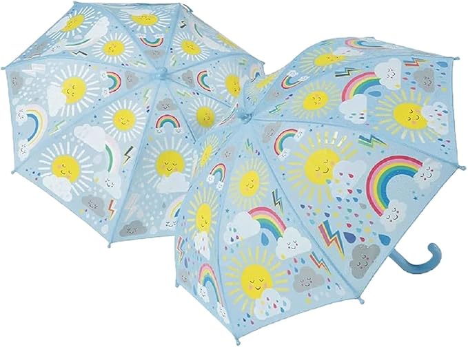 Watch as the white areas magically change colour in the rain, as it dries out they go back to white and it happens all over again when the rain comes back. Featuring our wonderful weather print containing sweet sunshines, rainbows, clouds and more. Complete with a handy velcro tie to keep neatly closed when not in use.