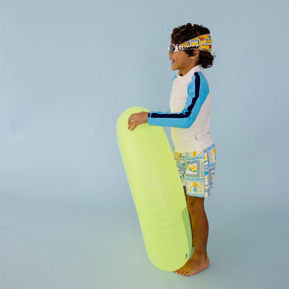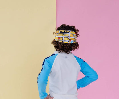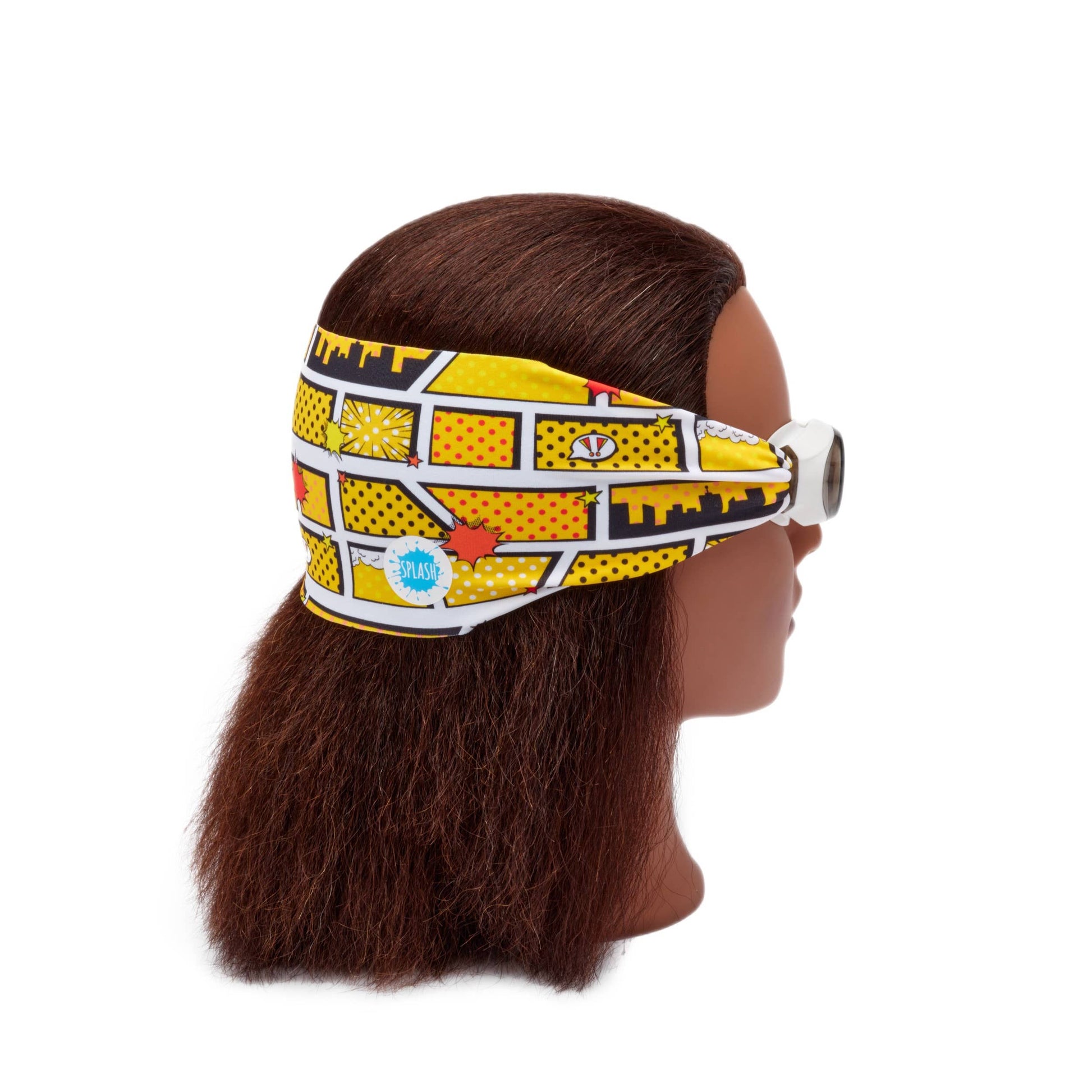 Our Comics swim goggle features our tangle-free strap in a bright yellow with black and white comic art print. Paired with a white frame and clear lenses. -One size fits kids to adults. Ages 3+ -No more pulled or tangled hair -Fun, fashionable, comfortable -High visibility, anti-fog lenses -Shatter resistant polycarbonate lenses -Hypoallergenic—latex & pvc free -Sensory friendly -Patented