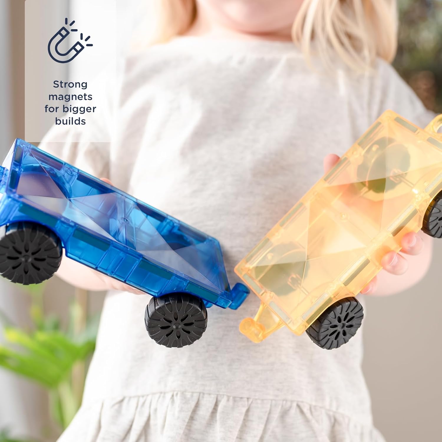 Add a new dimension to your magnetic tile play and get your imagination moving! The CONNETIX 2 Piece Rainbow Car Pack includes one blue and one yellow motion base featuring REAL rubber wheels and our unique bevel design. This pack promotes endless possibilities for children to design and create their own motion structures from cars, trucks, trains, buses, fire trucks, tractors and space cars, to moving robots, fantastical creatures, and so much more!