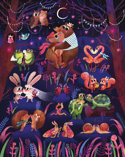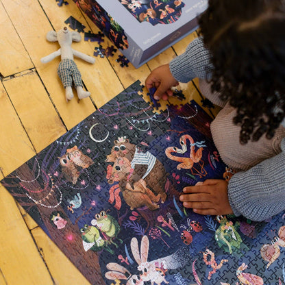 Illustrated by Olga Skomorokhova Welcome to a cozy night in the woods, where critters gather, pair up, and enjoy the magic of being together. With every piece, you’ll uncover sweet scenes and tiny tales hidden beneath the stars. ✨ 500 pieces for teens and adults 📖 A magnetic storybook-style box 👝 A soft cloth drawstring bag 🗺️ A large reference poster 🌱 Thoughtfully made with recycled materials, matte textured pieces and soy-based inks