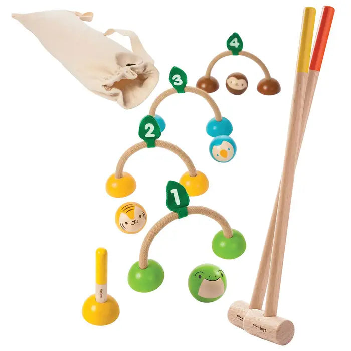 A favorite family game with a very friendly design. The colorful Croquet set can be played indoor and outdoor. The set includes 4 different animal wooden balls: bird, tiger, monkey and frog, 2 mallets, 4 wickets, and a final stand. Bag included.