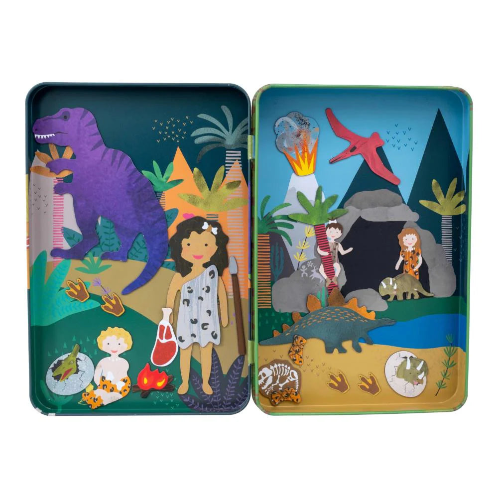 Playtime fun in a handy magnetic tin! Contains 3 sheets of pop out magnets so you can have fun sticking over 50 bright, fun magnetic pieces to the 2 fun scenes on the inside of your tin and let your imagination run wild creating fabulous pictures with dinosaurs, cavemen, volcanos, fossils and much more. A perfect pick up gift, printed with soy inks and made using recycled materials. When you're finished playing, the magnetic tin safely stores all your pieces ready for next time.