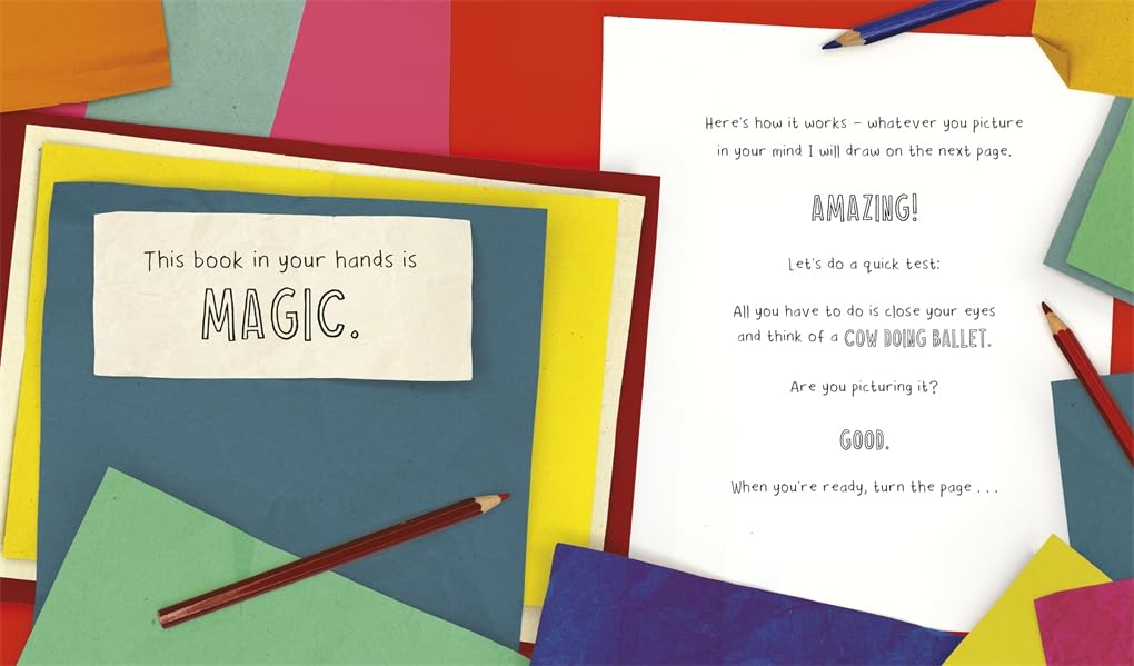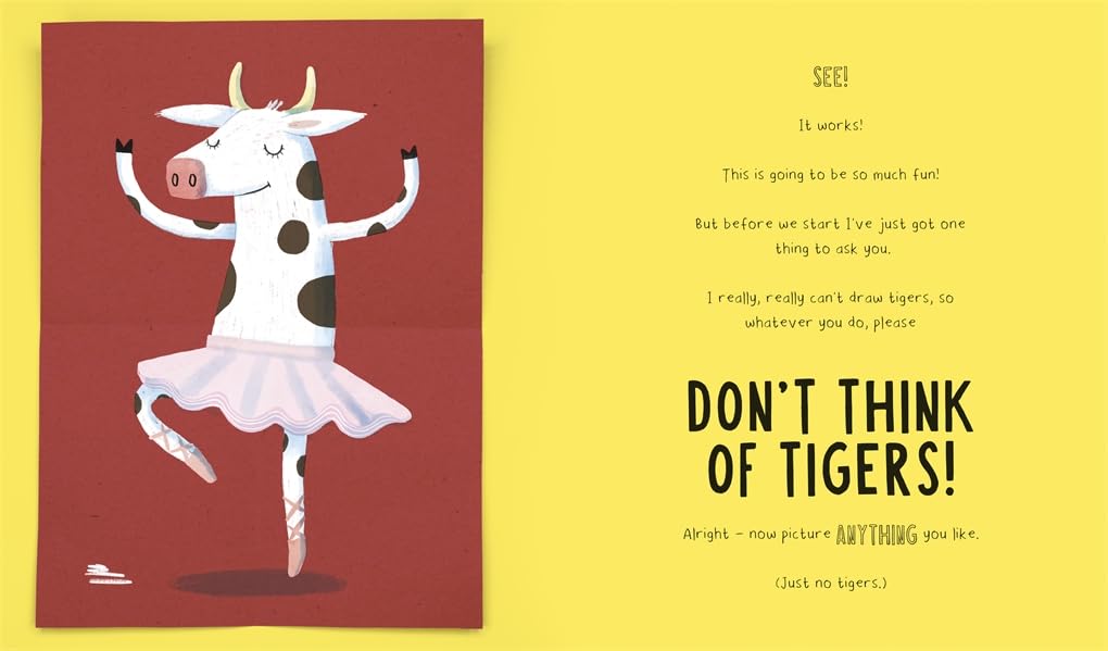 This book is MAGIC! Imagine anything you like, and the illustrator will draw it on the next page. There's only one rule: DON'T THINK OF TIGERS! Ready?