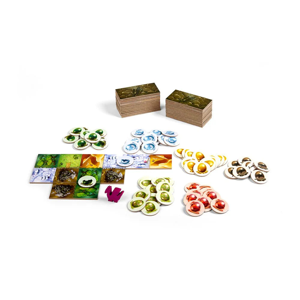 Includes 28 exploration dominoes, 69 Egg Tokens, 1 Mommy Dragon meeple, 4 Starting Dominoes, Illustrated Rules