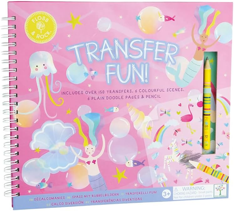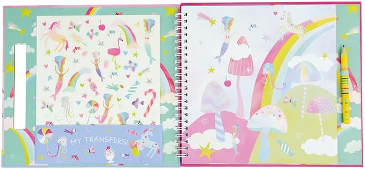 There's so much fun to be had with Transfers! This Fantasy Transfer Fun comes with over 150 fantastic Fantasy themed transfers, 6 colourful scenes to place them onto, 6 plain pages for freestyle doodling and a pencil. Open the spiral bound book to find all your transfers neatly stored in the 'My Transfers' pocket, find your chosen illustration and flick through the pages to find the perfect scene to put them onto. Scratch over the top of the drawing with the Floss & Rock pencil provided and lift up the sheet, like MAGIC you'll find them transferred onto the page. Spend many happy hours sparking creativity and making beautiful pictures with mermaids, unicorns, fun fish and more!