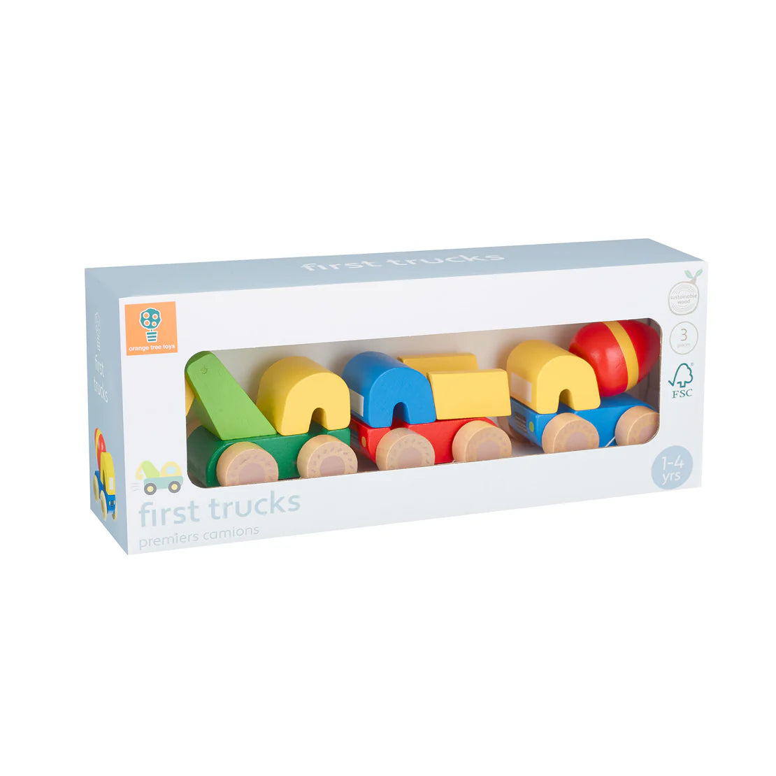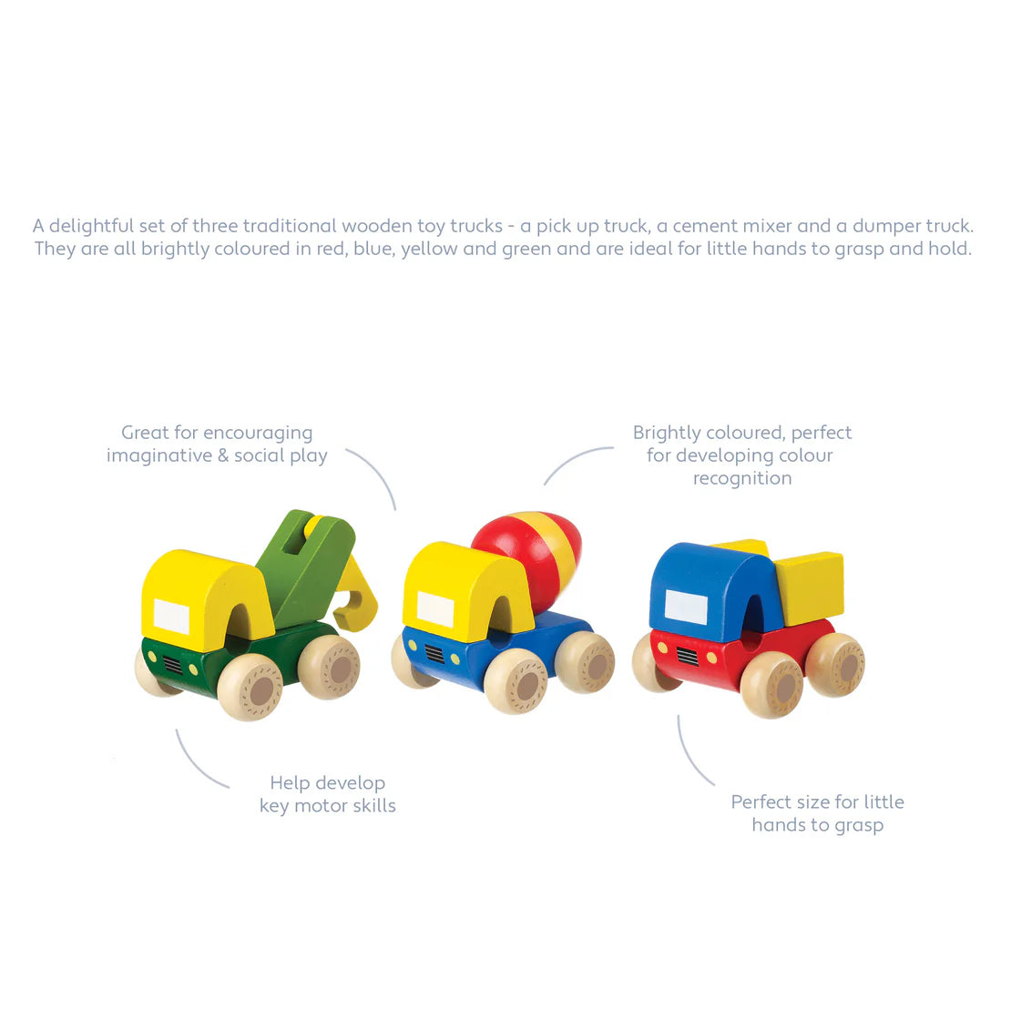 A delightful set of three traditional wooden toy trucks - a pick up truck, a cement mixer and a dumper truck. They are all very brightly coloured in red, blue, yellow and green and are ideal for little hands to grasp and hold.