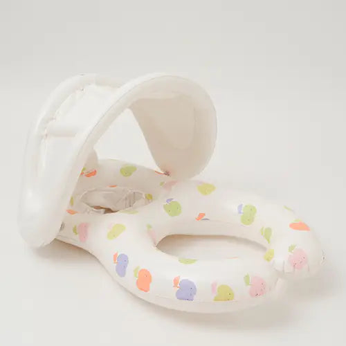 Max. weight: 11kg/24lbs Caregiver and baby float. Includes removable canopy for added shade. Features soft leg support and head rest for the baby. Includes repair patch in case of punctures. Made from durable, non-toxic Phthalate free PVC. Our floats and inflatables carry important safety labels that may not be shown in all photography. Children must be under supervision when using this product.