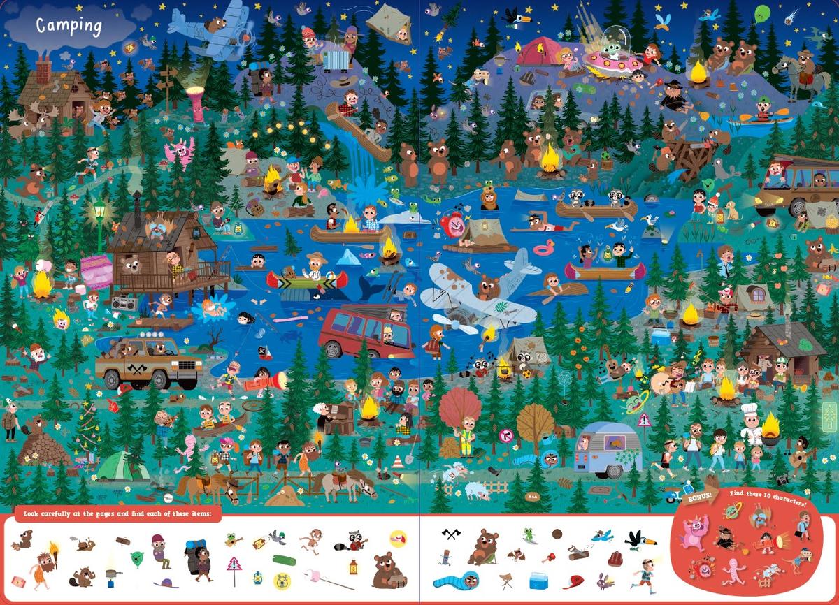 A GIANT seek-and-find book for hours of fun, with 9 different scenes and more than 50 items to find on each scene!