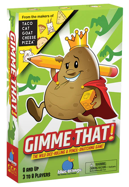 Gimme That! is the wild potato mashing, high frying, pencil grabbing party game. As a new recruitfor the Bureau of Spud Management, your assignment is counting potatoes. But – watch out! Everyone else has the same job and there’s only one pencil. Will you be the next Spud King?