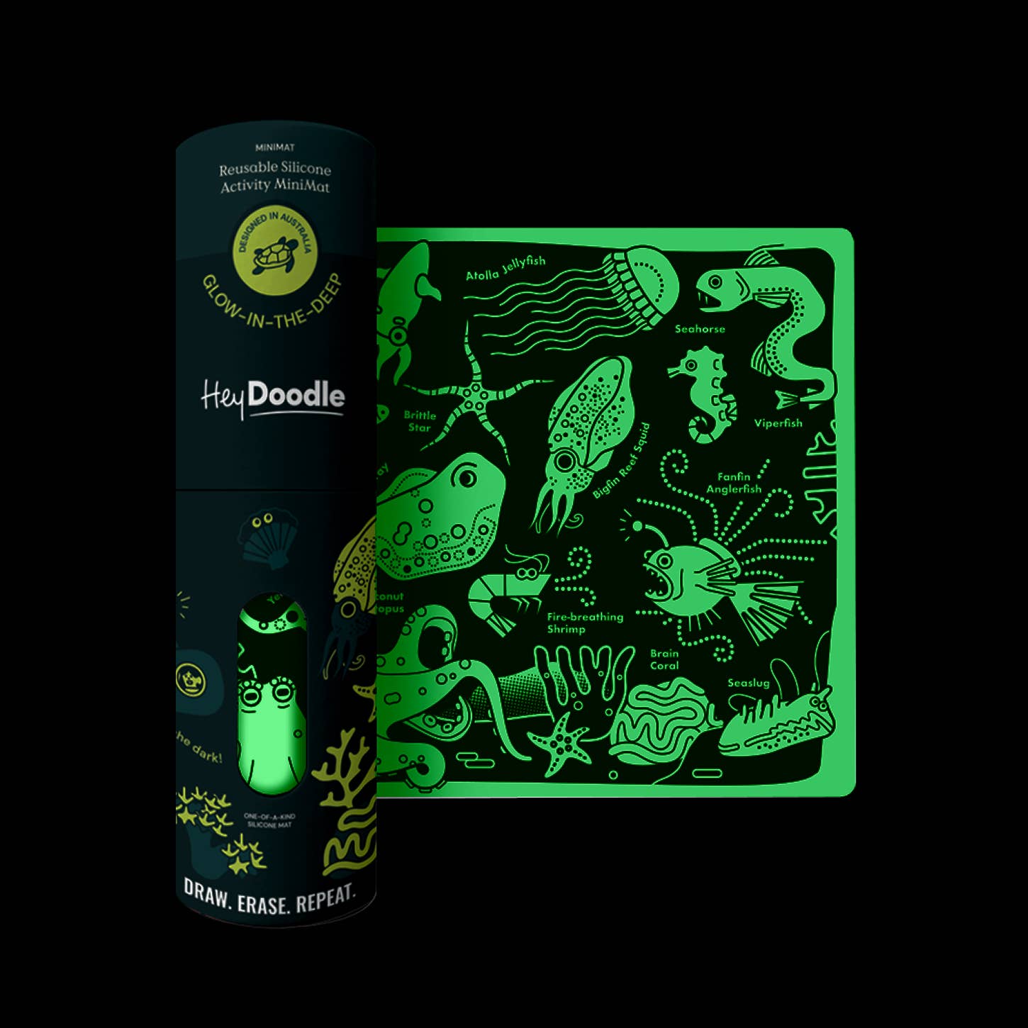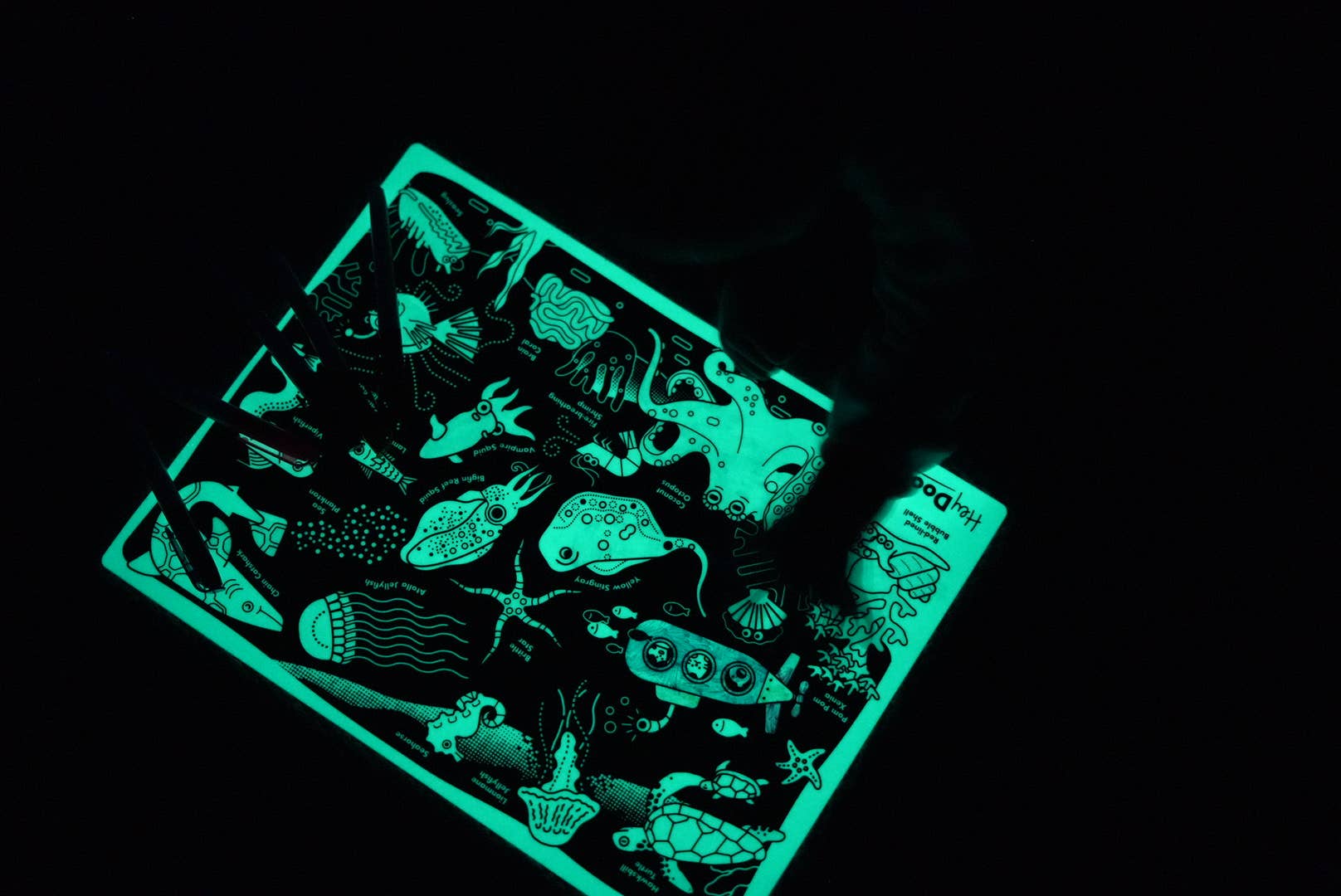 Sail to new depths to this underwater world! When the lights go out, watch the mat come to life as it actually GLOWS!!! It really GLOWS in the dark! Get to know these bioluminescent creatures as you colour and create with this seascape. Best thing is, as with all HeyDoodle mats, they can be wiped clean and reused!
