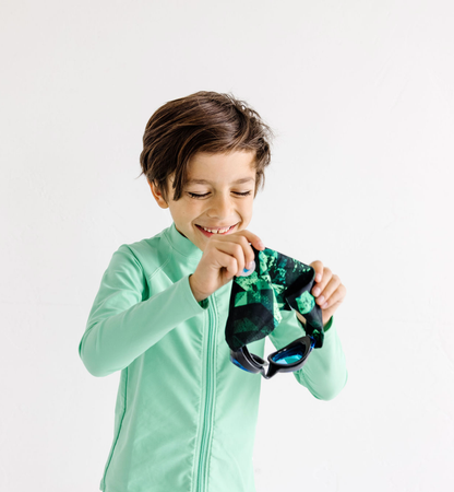 Our Green Fusion swim goggles feature our tangle-free strap in solid black on a black frame with lightly tinted blue lenses.