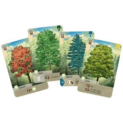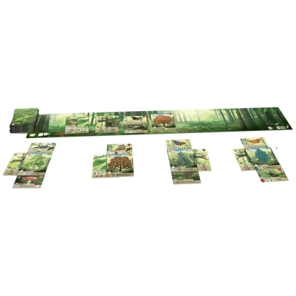 Components include 180 multifunctional cards, a central game board, and a scoring pad. During the game, players attempt to gather more trees than their opponents. Taking turns playing cards from their hand, they must attract wildlife by combining plants and animals for extra points or bonus actions. But the animals have different preferences, some favoring dense treetops, others lush undergrowth, which players must take into consideration as they combine plants and animals to earn points. The player with the highest score wins the game.
