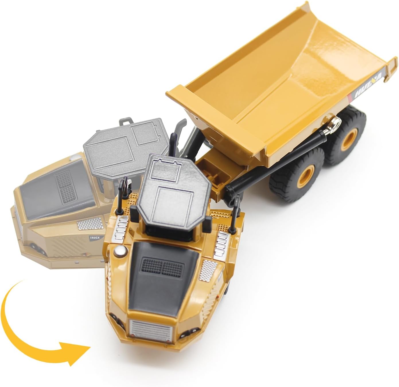 - Die-cast articulated dump truck model. Made of high quality metal and some plastic.