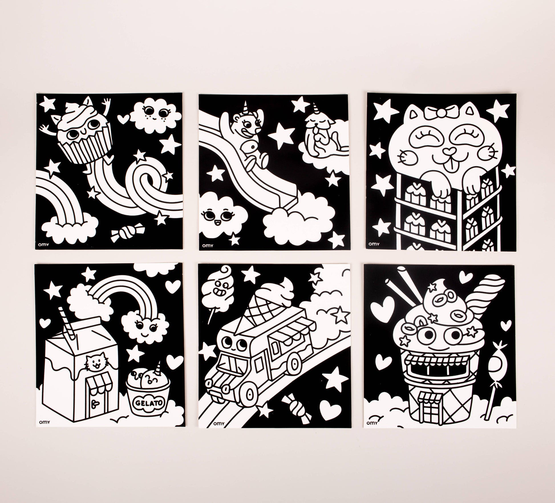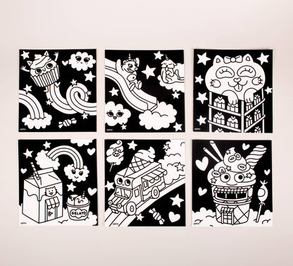 Cupcakes, rainbows, and kittens...discover the fun and adorable Kawaii universe throughout 6 velvet coloring sheets !
