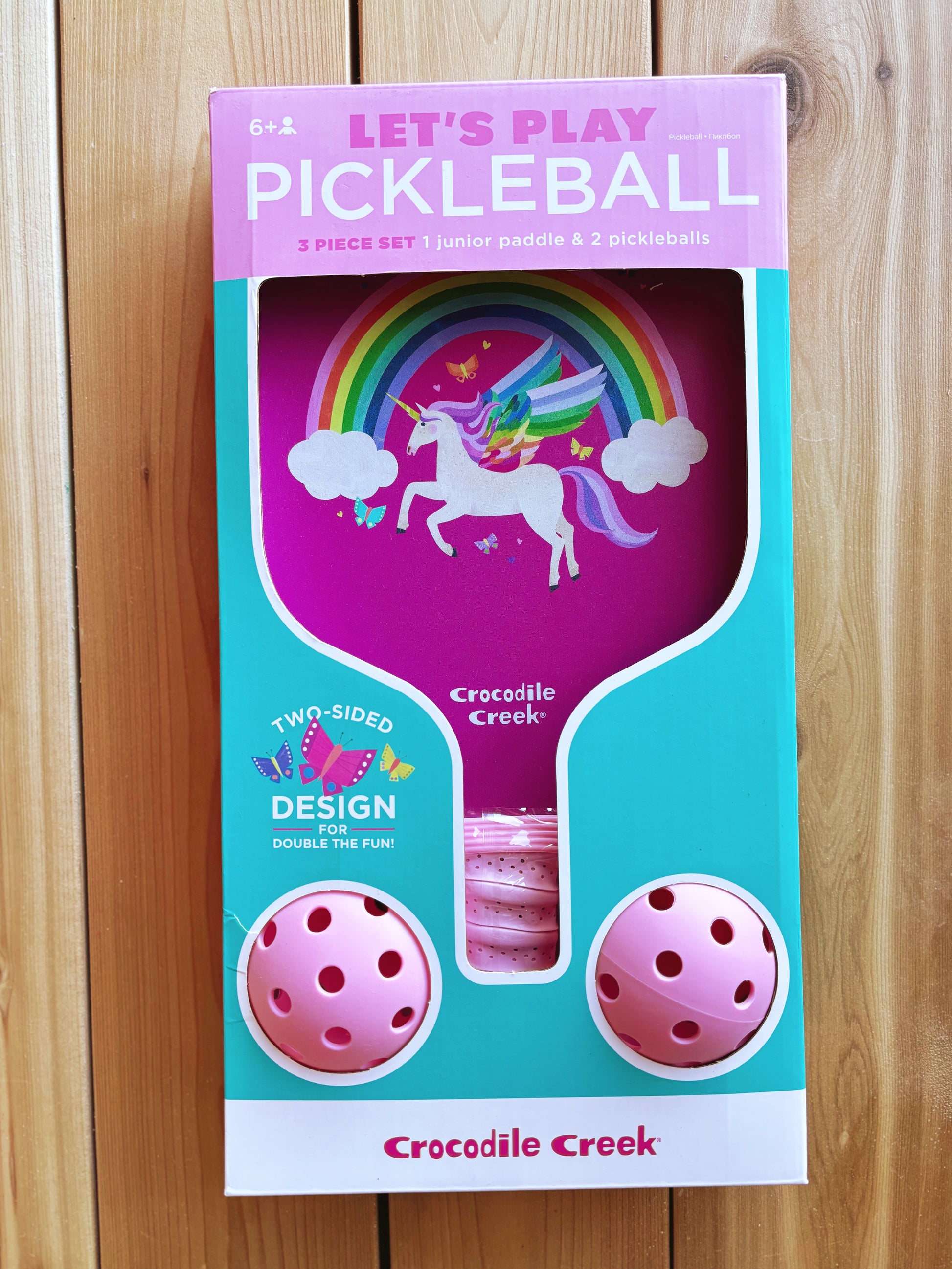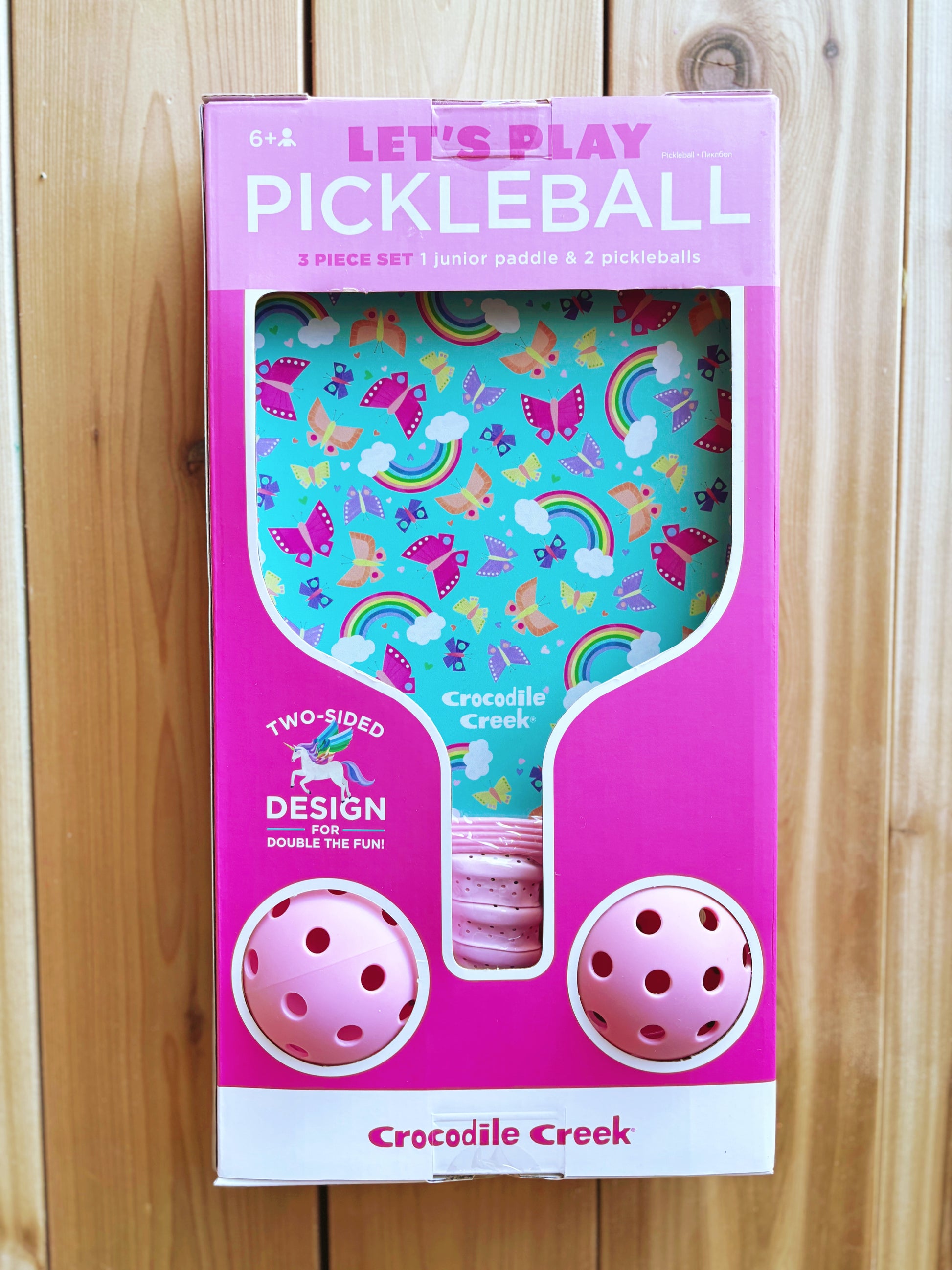 The perfect Pickleball set for littles! Features adorable unicorn with butterflies and different pattern on each side.