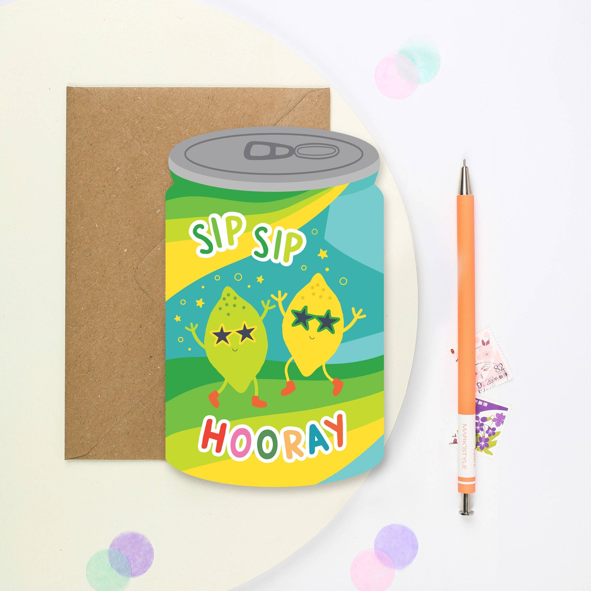 Celebrate birthdays or a congratulations with a burst of fun using our quirky Soda Can-Shaped Greeting Card. This unique greeting card, designed to resemble a classic can of pop, features cute illustrated lime and lemon characters with fizzy bubbles, adding a playful and refreshing touch to any birthday celebration. It has a light blue, yellow and lime green background and the caption reads ‘Sip Sip Hooray’ Crafted from high-quality card, it's an excellent choice for anyone who loves vibrant, imaginative designs. Made in the UK Size: 105mm x 150mm Uncoated premium, responsibly sourced card Paired with a kraft envelope Blank inside Supplied without cello packaging This children’s card is part of the Snacks collection from Mifkins.