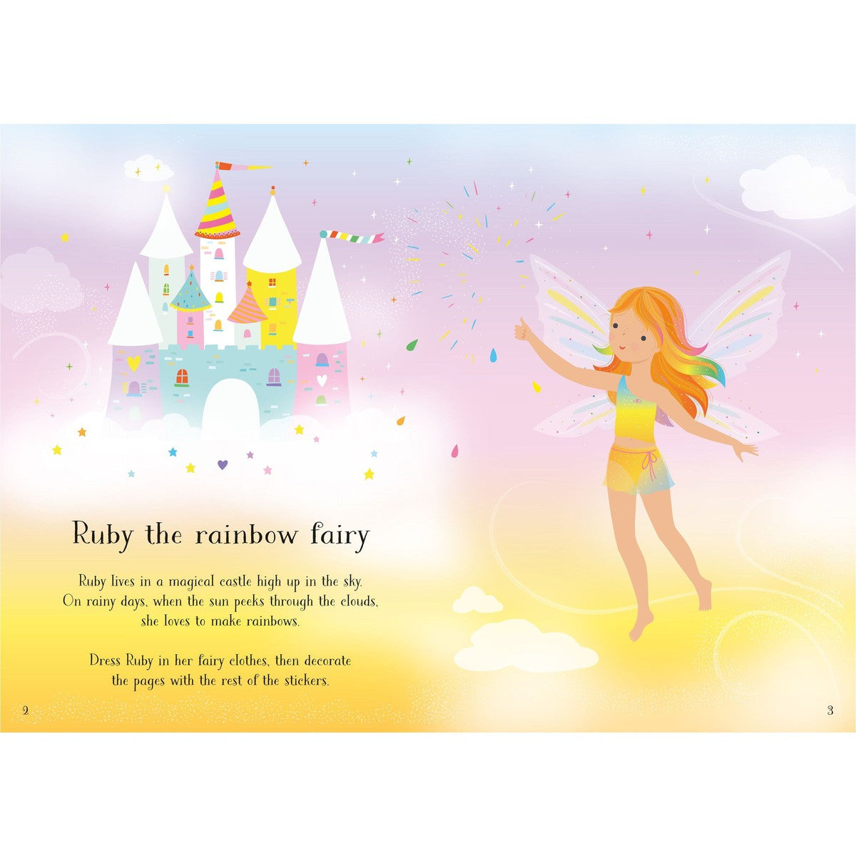 Follow Ruby the Rainbow Fairy as she flutters around Fairyland in this enchanting sticker book.There are lots of magical scenes to decorate, from an orange grove and yellow meadow to painting rainbows in the sky. With over 200 stickers of outfits, animals and flowers to dress the dolls and decorate the pages.
