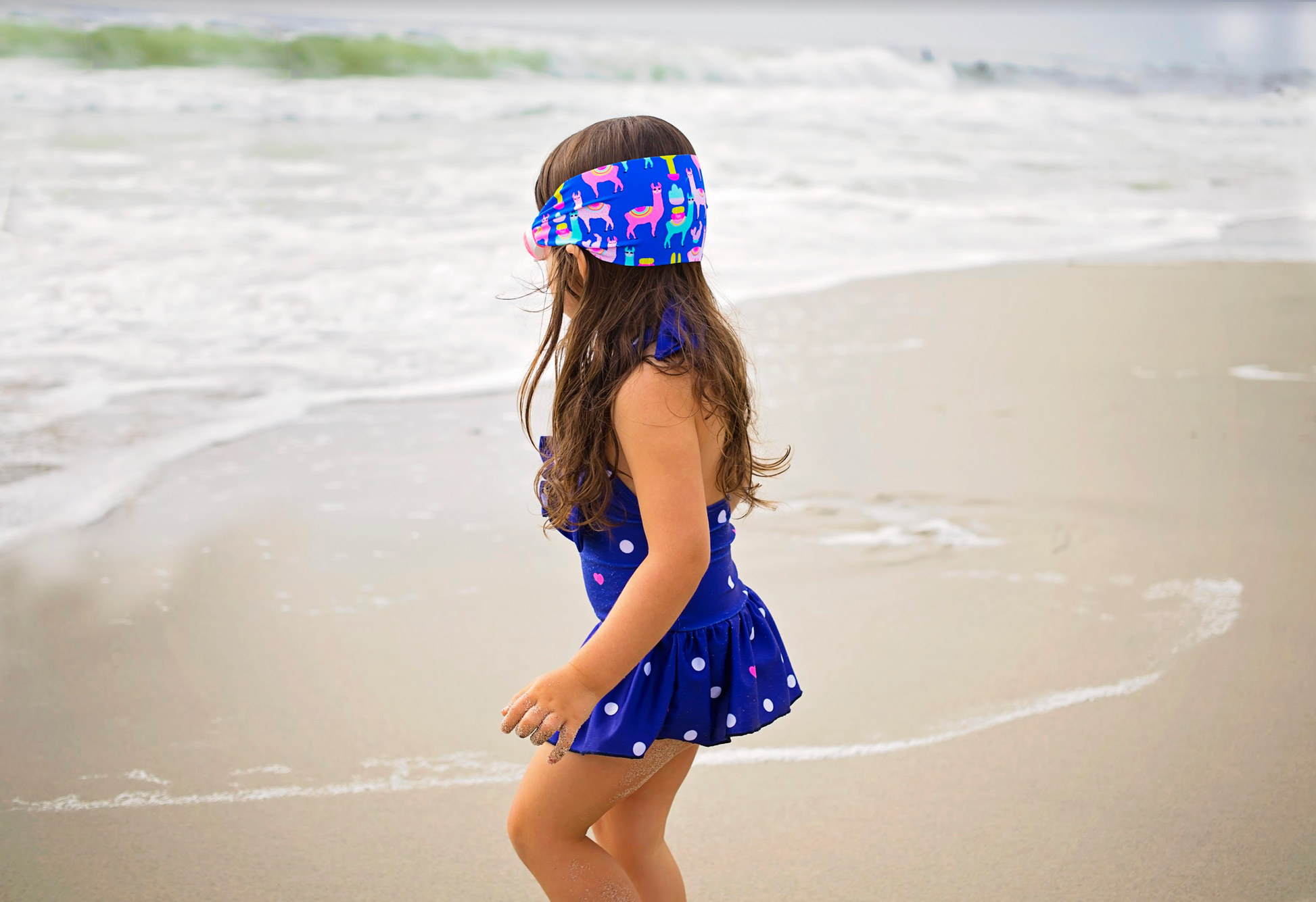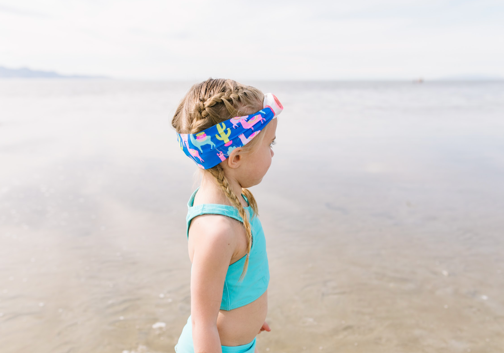 Our Llama Fiesta swim goggle features our tangle-free strap in a colorful llama and cactus print, paired with a white frame and lightly tinted pink lenses.
