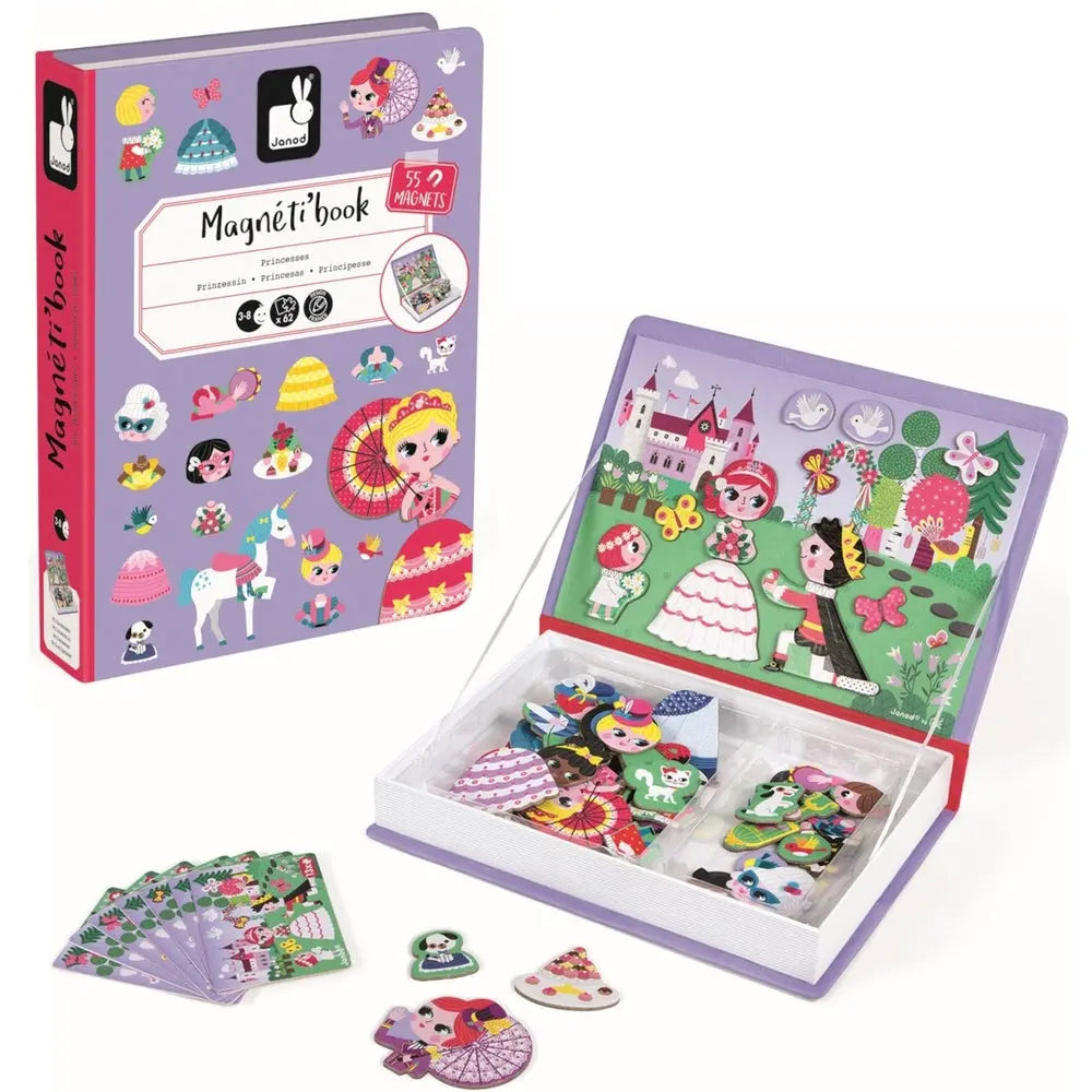 Magnetic educational game in cardboard on the princess theme. Composed of 55 magnets and 7 cards. Once the book is opened, the aim is to make on the stage the same scene as indicated on the card thanks to the magnets.