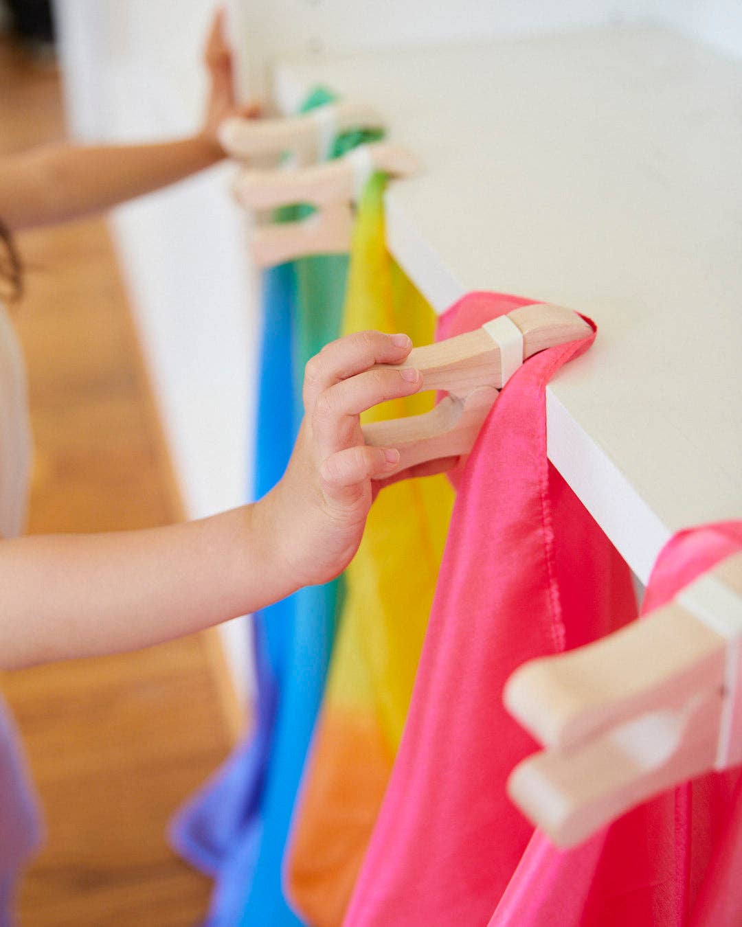Maple Wood Play Clips are perfect for fort building. They grab cloth, blankets and silk and anchor them to hard surfaces to make it easy for kids to create play spaces.