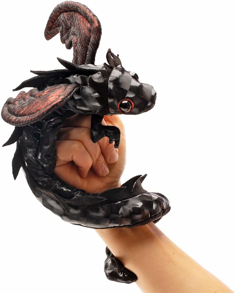 Bring dimension to your wardrobe with the stylish Folkmanis® Midnight Dragon Wristlet puppet. Featured in black with red accents and unique holographic skin, this wearable puppet will give the illusion that you are the "mother of all dragons." Place head onto one finger and secure magnetic tail wrap to wrist for fantastic movement.