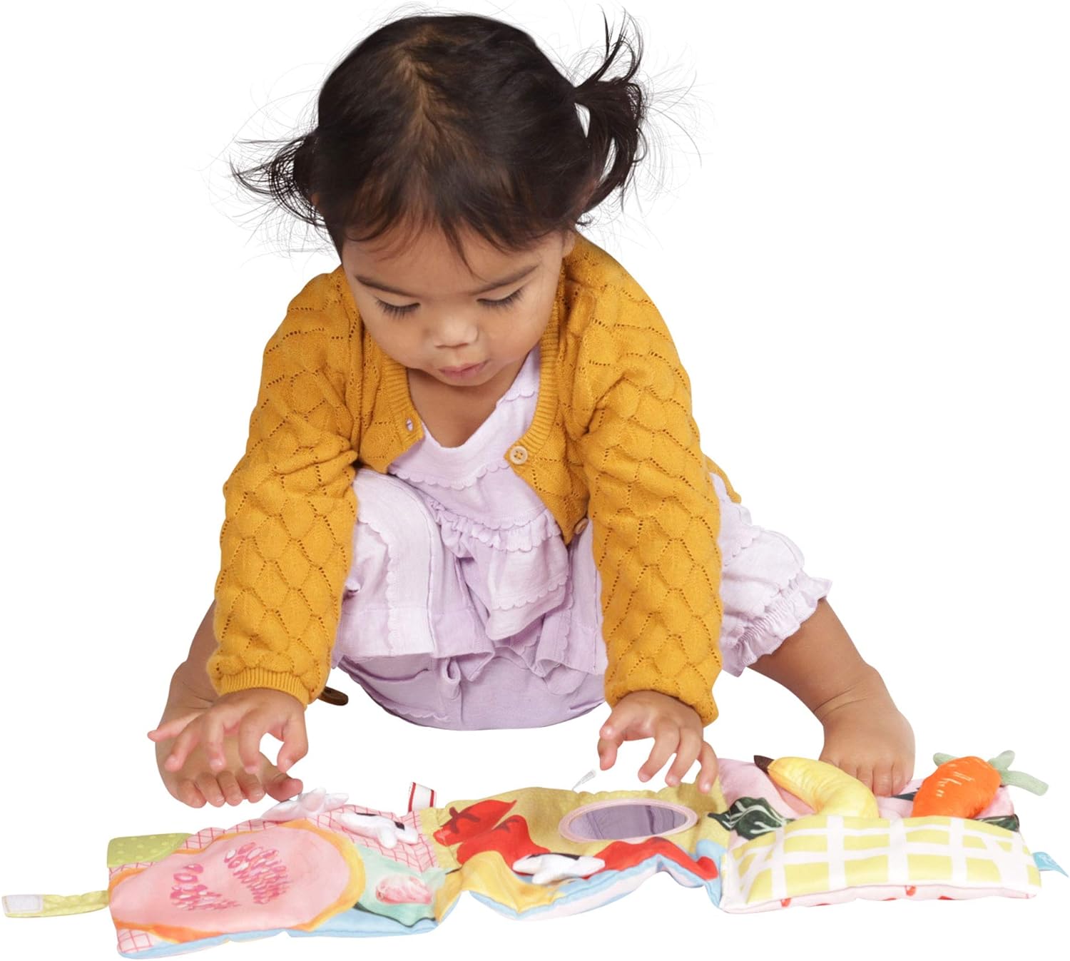 Soft textured fabrics for story-time fun and tummy-time play. The fruits and vegetable-themed soft activity book includes a variety of fabric textures for baby. Each page features colorful illustrations, soft textures and playful surprises. A fabric closure keeps pages neat when playtime is over. Activities include 3D cherries, textured teether corner, baby-safe discovery mirror and a basket pocket for storing tethered on crinkle carrot and banana. Fabric loop allows for attachment to baby links, carriers, strollers and more. Encourages tummy-time play, motor development, sensory stimulation and cause and effect learning. Mini-Apple soft book is safety rated as a toy for infants 0 months and up. This soft book measures 6.5L x 6.5W x 2 inches thick.