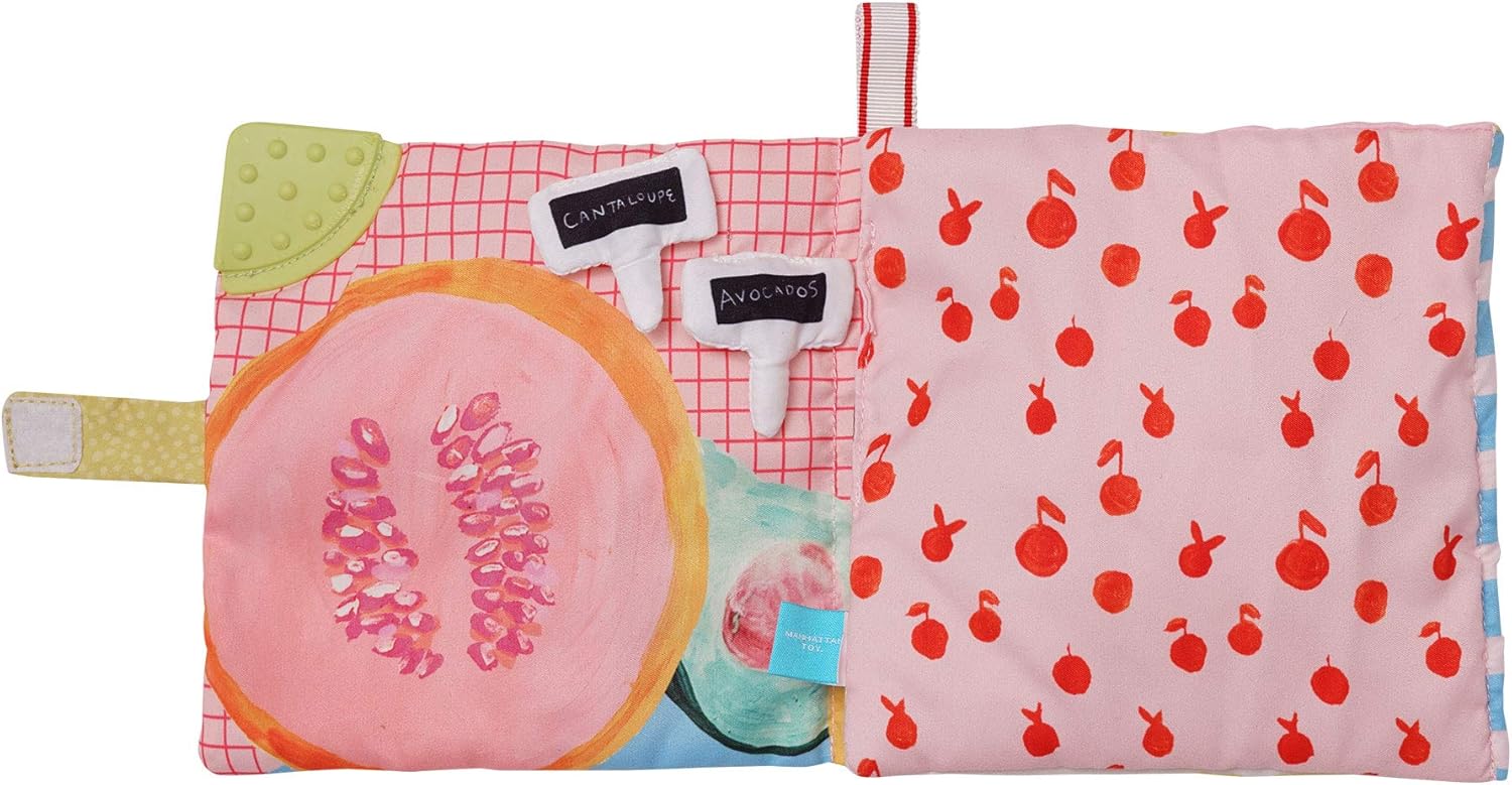 Find fruity fun with this soft activity book. Themed with fruits and vegetables this book has 3D cherries, a mirror, and a textured teething corner!