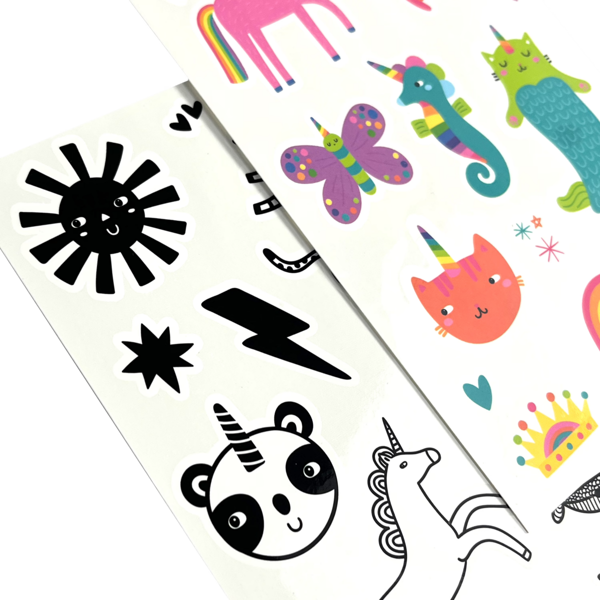 Happy was just made wearable with these unicorn party tattoo sheets. Durable and long lasting, these charming temporary tattoos are perfect for birthday parties, sleep overs, or any gathering of creative kids! What does it take to throw a unicorn party? Just put on some of these temporary tattoos, bring your imagination, and you’ve got a shindig that’s magically amazing! This mini pack includes three tattoo sheets of temporary tattoos that are constructed to be durable and long-lasting. Two sheets are in full color and one is in black and white. Designs include unicorns, butterflies, hearts, rainbows, and more. These are perfect as party favors, as a party activity, or even just as a fun thing to do on a relaxing afternoon with your little one!