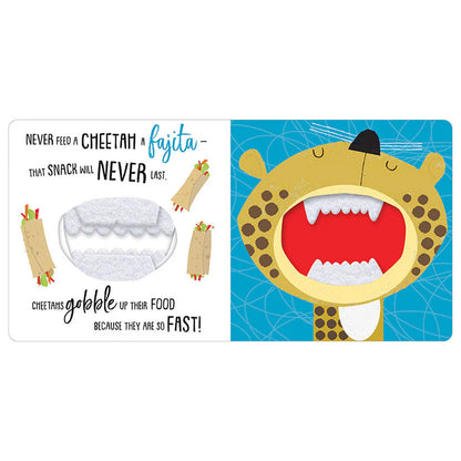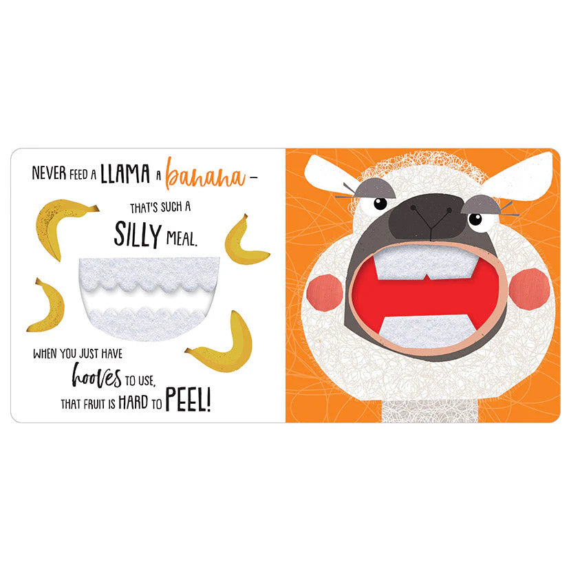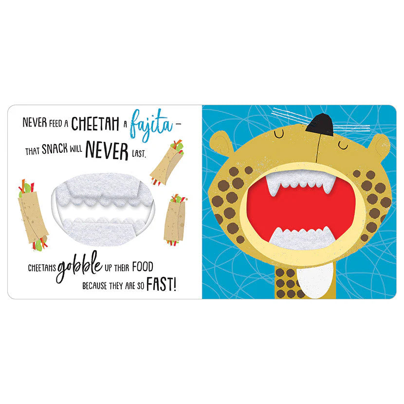 Don't offer llamas bananas, avoid giving cheetahs fajitas, and never EVER feed a yeti spaghetti! Enjoy more mealtime mayhem with this hilarious book, featuring giant open mouths and felt teeth.