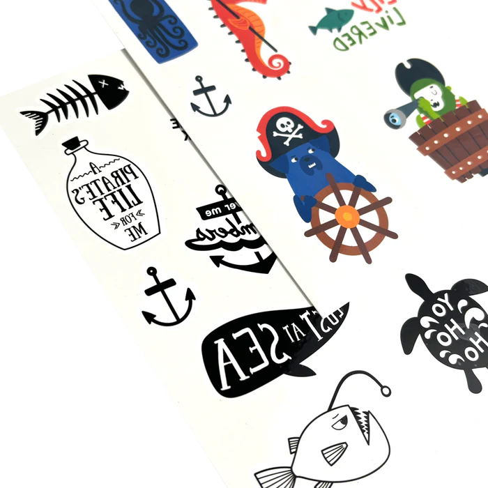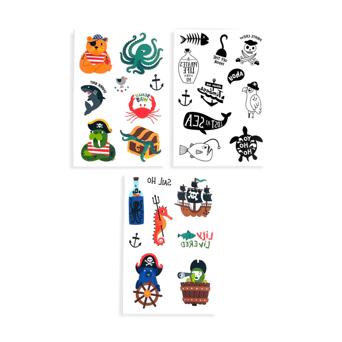 If you’re looking to put a smile on your kiddo’s face on a blimey, land-locked afternoon, these temporary tattoos are something they’re sure to be liking. Three tattoo sheets are included in this pirate themed set! Little matey’s will be cheering that they’re just arrr-mazing! What’s even better than pirate treasure? Pirate temporary tattoos! Designs are fiercely silly and include boisterous buccaneers like the wily walrus, the marauding monkey, and the booty-loving bear. These long lasting and durable temporary tattoos are a real treasure and sure to be loved by your little matey. They also make pARRRfect party favours for your kiddo’s next birthday party!
