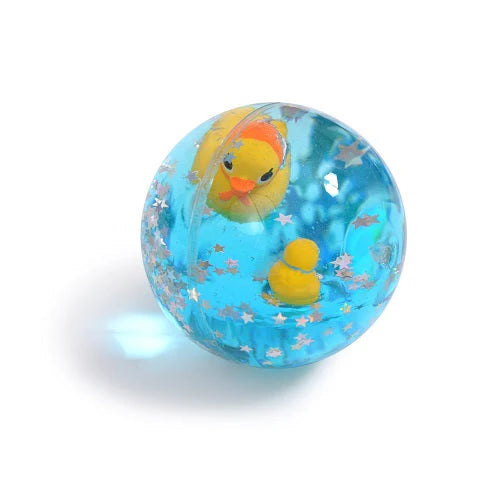 Bouncing ball filled with colored liquid, where we see a duck bathing in the middle of shining stars! Measures approx 6 x 6 cm. Safety rated for children 3 years old +.