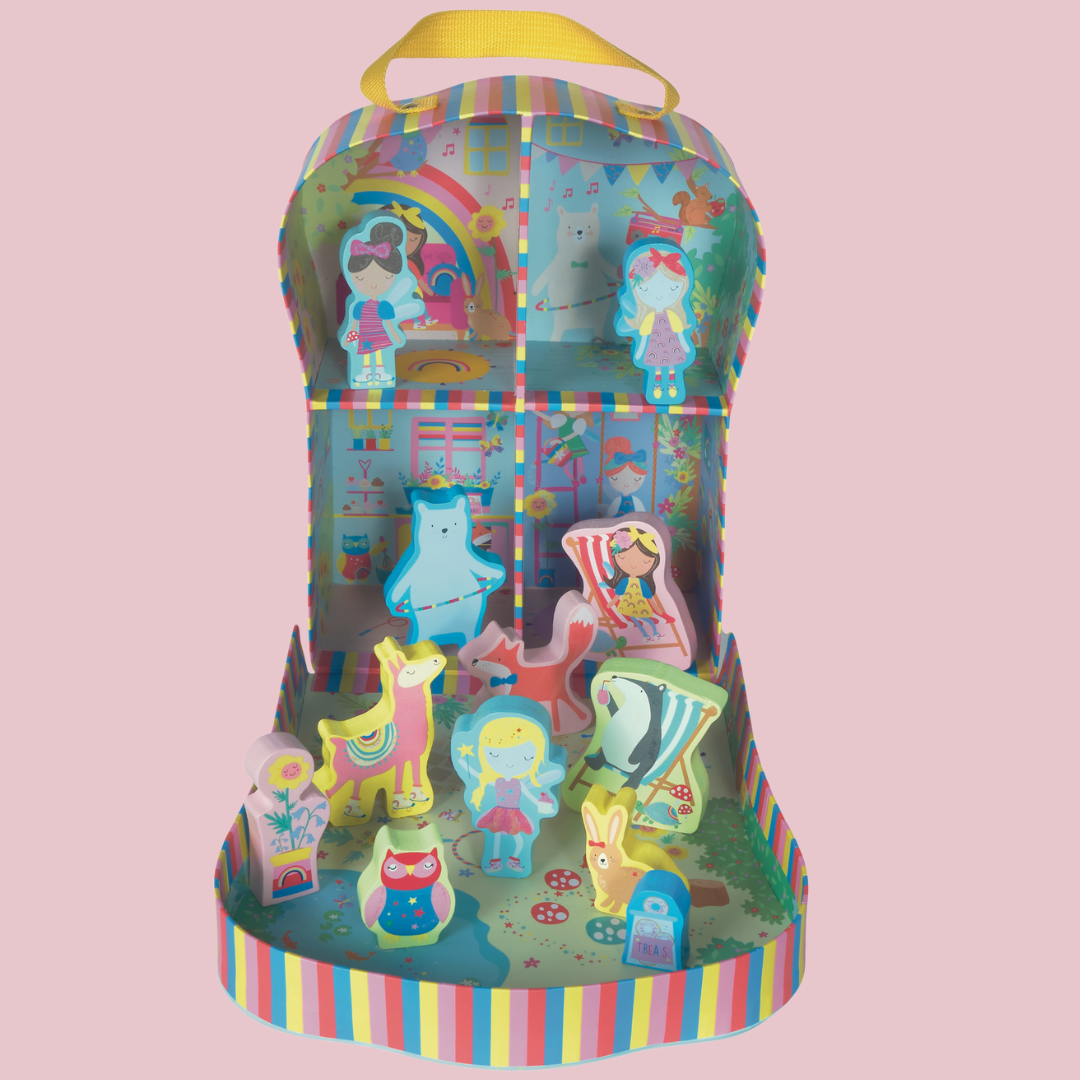 Bright and beautiful Rainbow Fairy Playbox is perfect for on-the-go. This is a compact version of our extremely popular Rainbow Fairy Play House. The reusable box folds down to reveal four fun rooms and a gorgeous garden. Imaginations will run wild with 10 double sided wooden characters including fairies, unicorns, a hula hooping bear and a roller skating llama! When you’re finished playing, pop your wooden characters into the handy drawstring cotton bag, close your box and use the cool carry handle to take it off on your next adventure.
