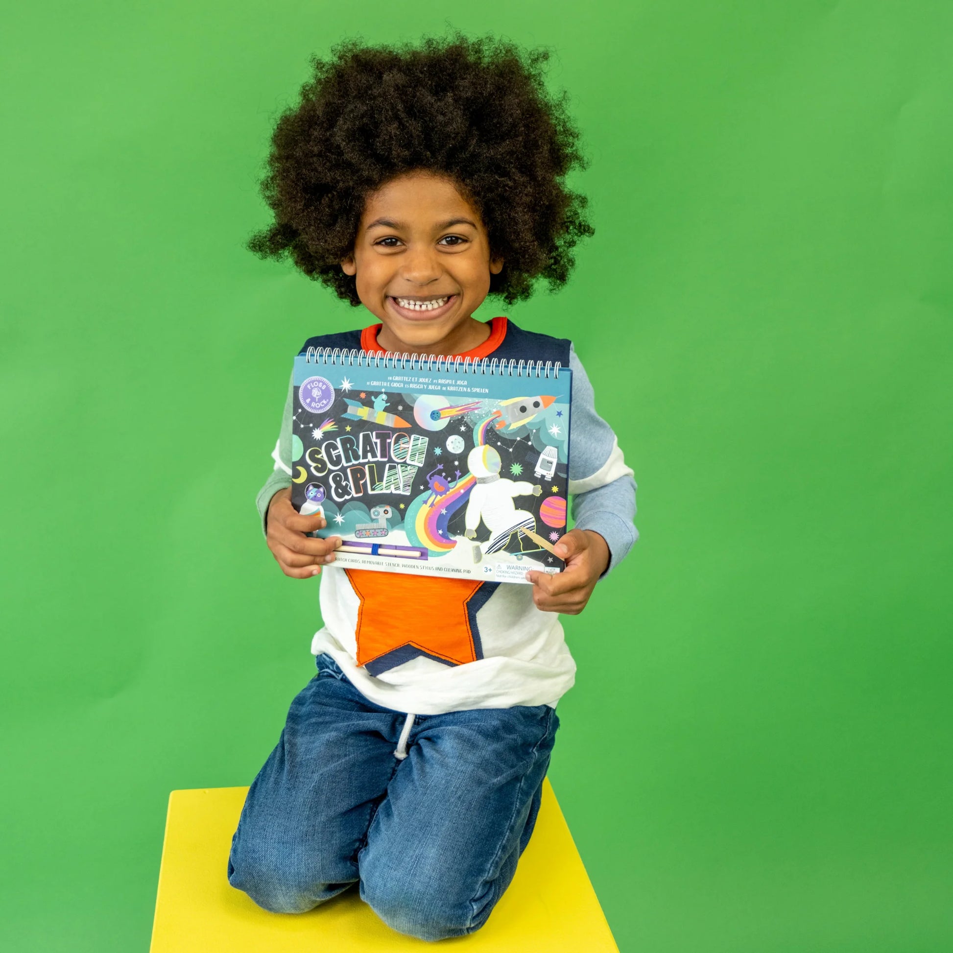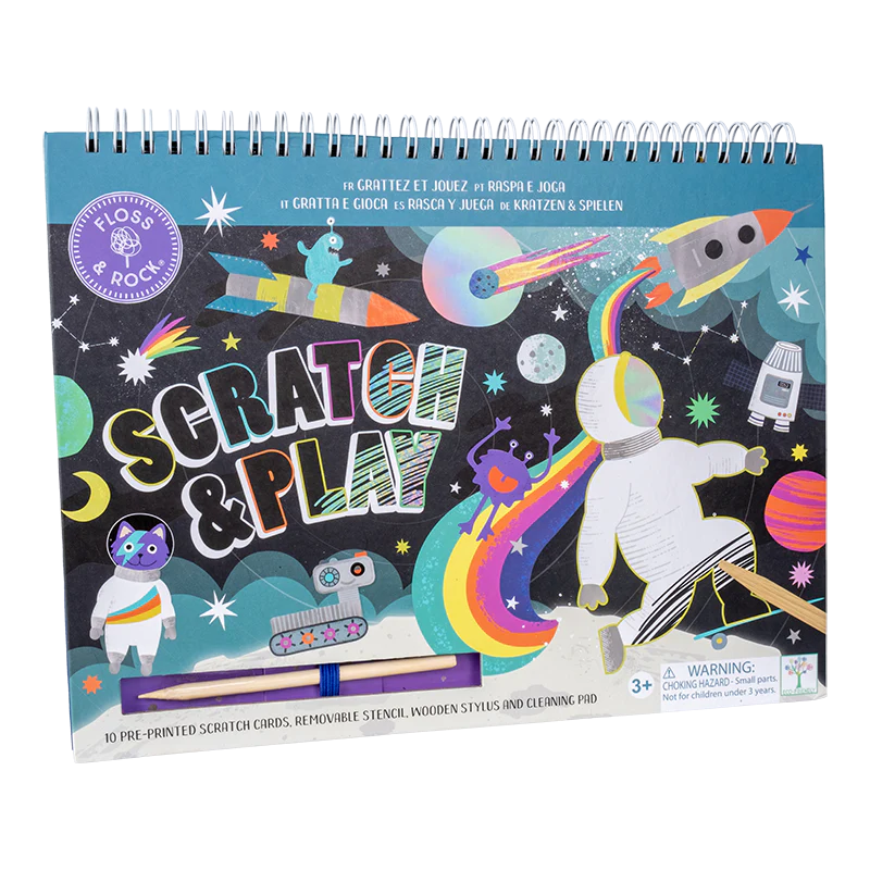Scratch away and play! Hours of creative fun can be had with our Scratch & Play spiral bound books. Inside you'll find 10 pre-printed scratch cards containing our super Space illustrations - space people, planets, rockets, aliens and more. Using the wooden stylus included you can scratch to 'colour in', create new lines or coloured shapes. The stencil card included can be taken out and placed anywhere in the book, meaning you can follow the guidelines to scratch an alien space ship, skateboarding space person and more!