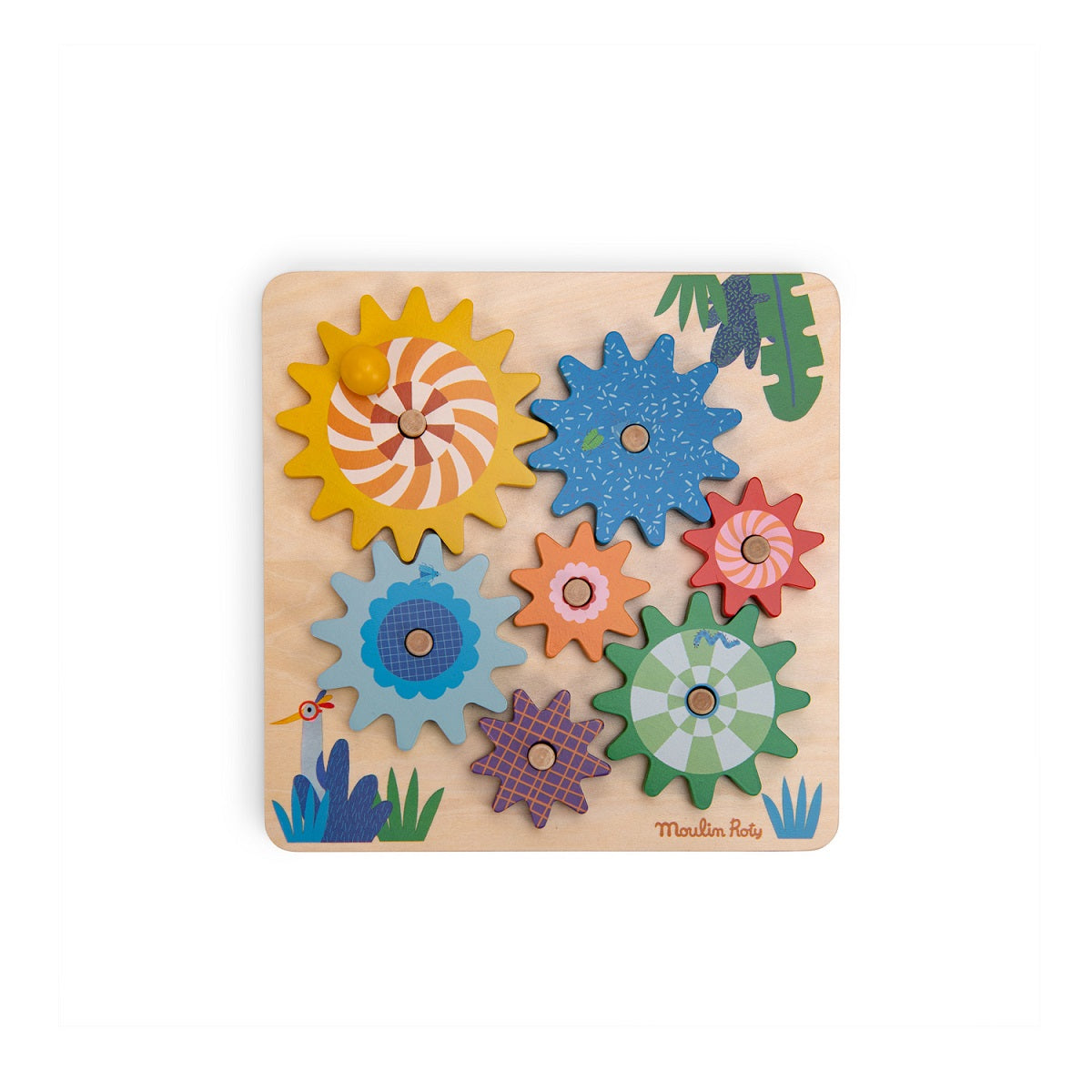 Wooden game to discover gear mechanisms. Position the 7 multi-coloured toothed wheels correctly on the wooden axles. When the yellow wheel is activated with the handle, the whole set starts to rotate in all directions. Washable with a soft and damp cloth. Measures approximately 21.5 x 21.5 cm. For ages 2+.