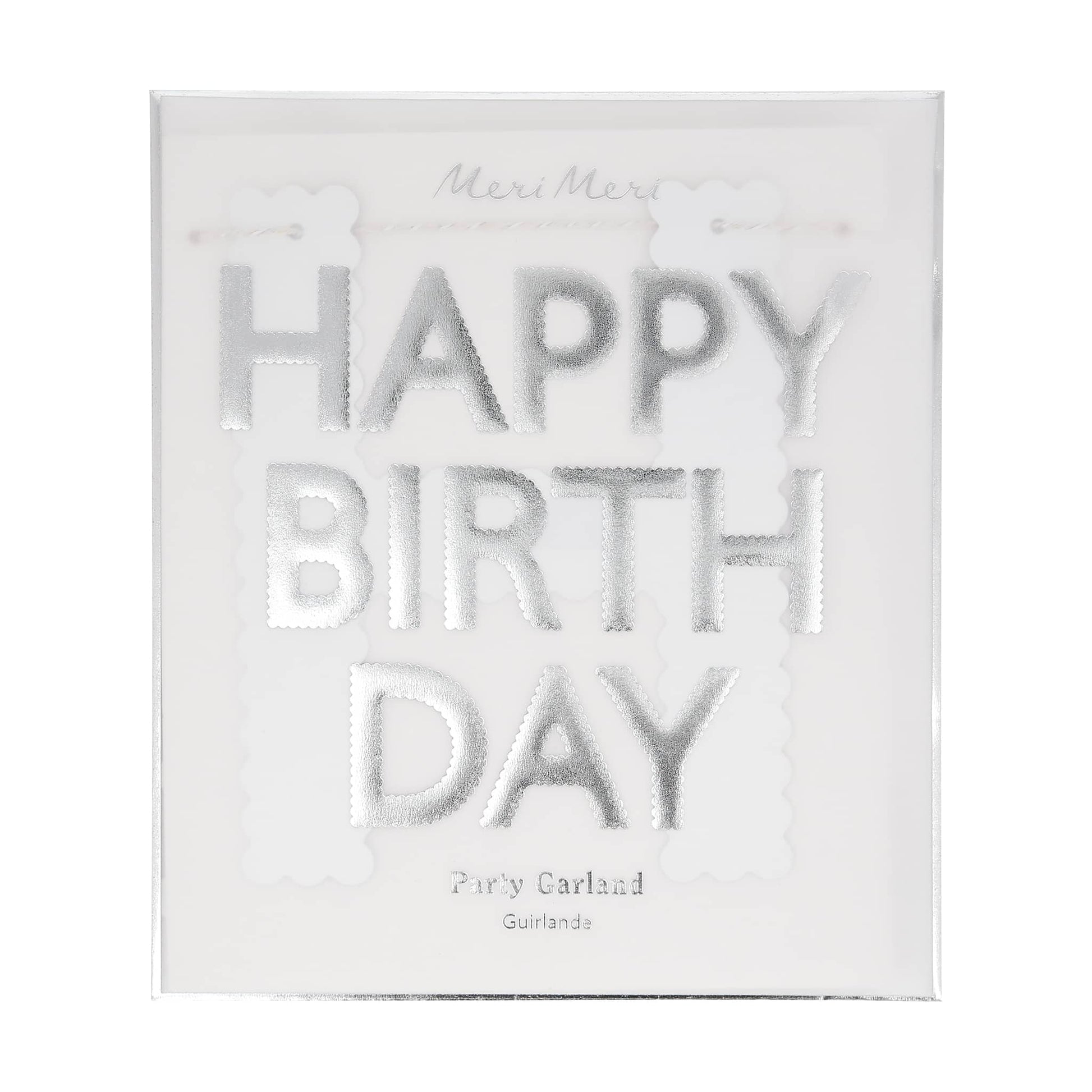 - 13 Scalloped shiny silver foil letter pennants spell out the words 'Happy Birthday'