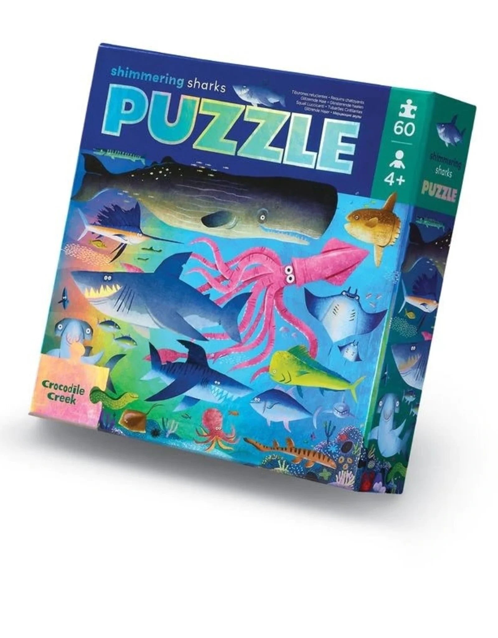 The World of Whales, Sharks & Turtles! Kids are fascinated by whales, sharks and other sea life! This fun 14” x 19” puzzle allows children to explore and discover an amazing variety of creatures under the sea. Printed on holographic foil. A perfect gift for children ages 4 years and up.