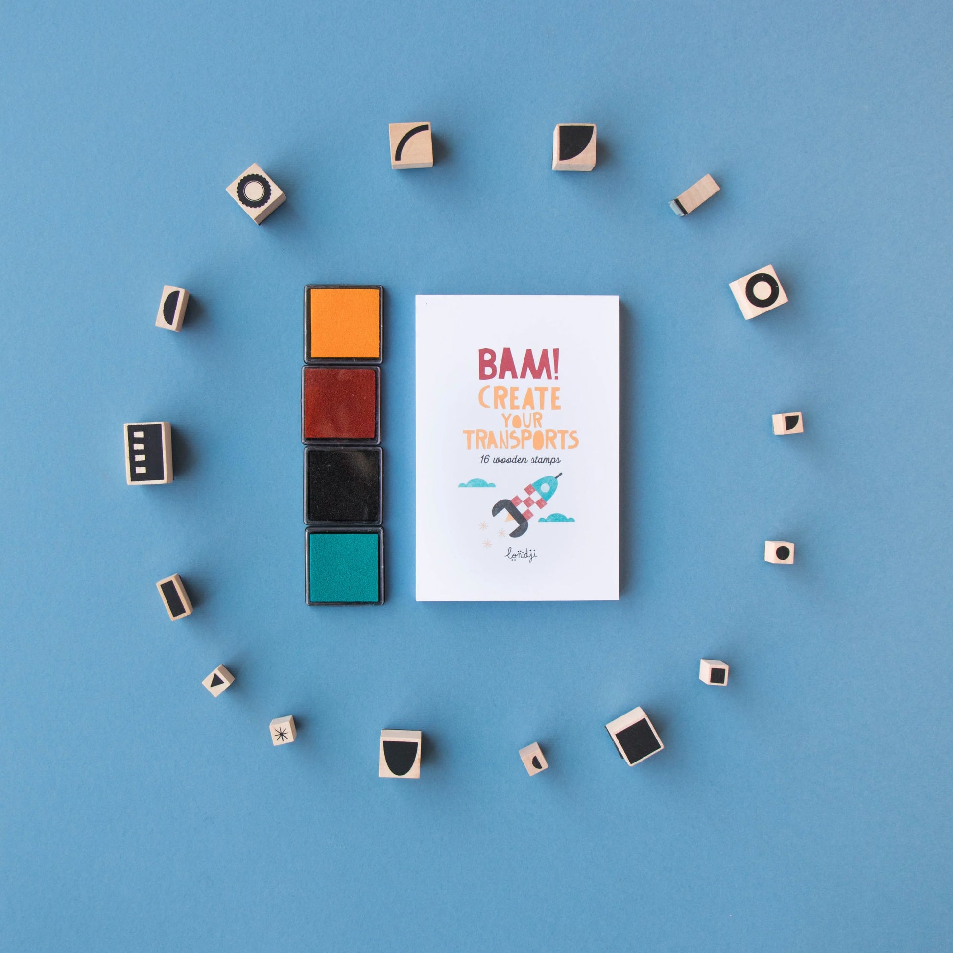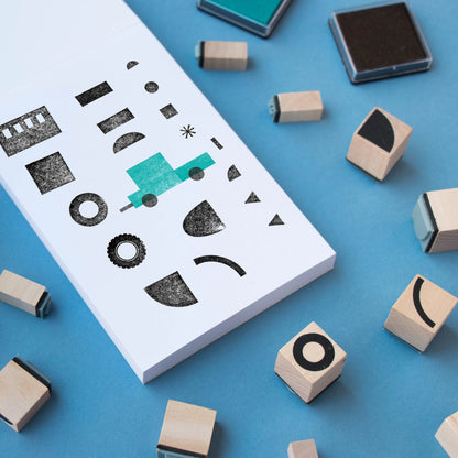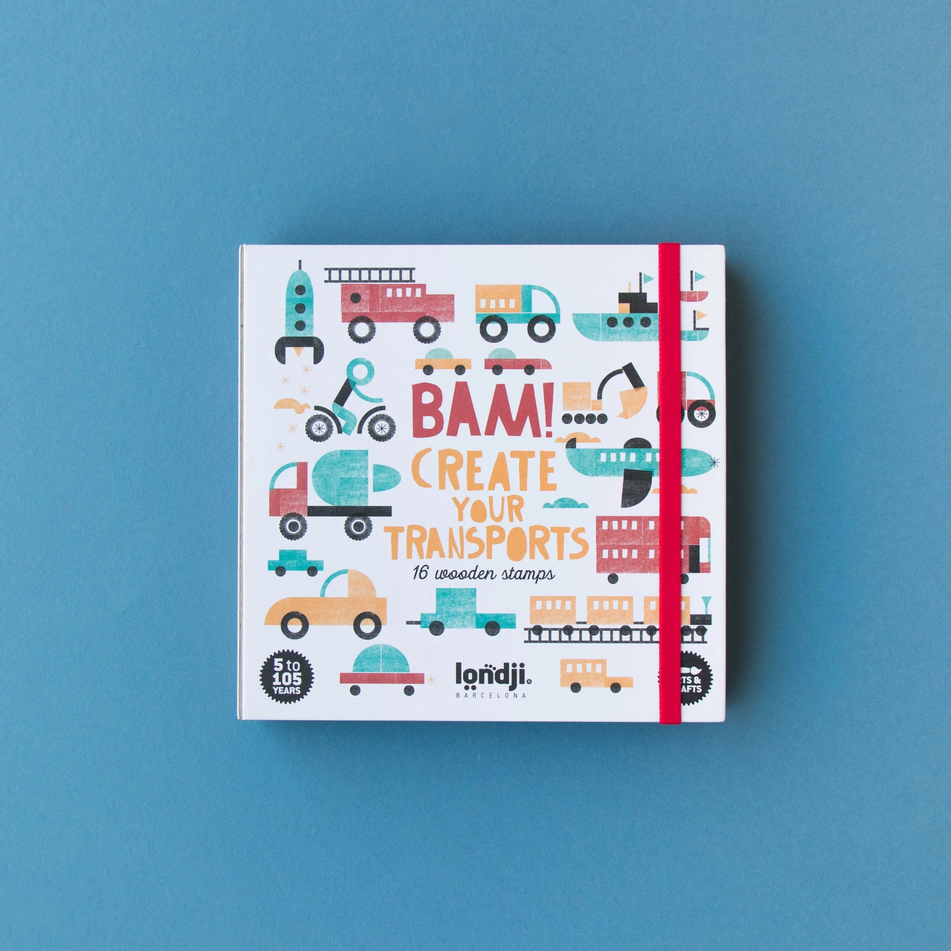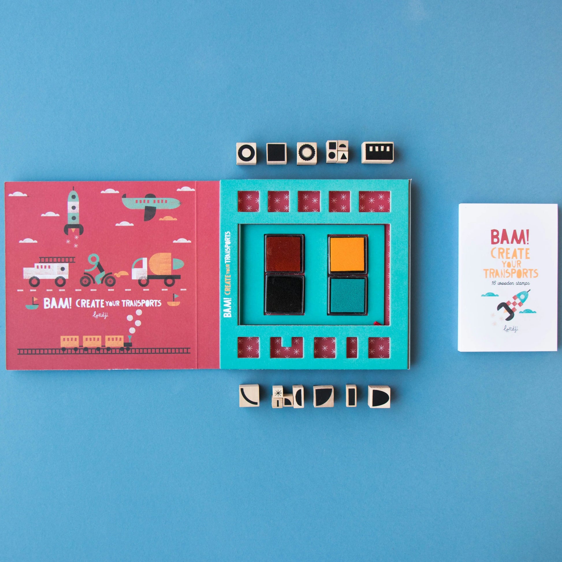 Create your own transports with stamps! Cars, planes, rockets, trains... and as far as your imagination goes! 16 wooden stamps with notebook included for your creations! Illustration by Can Seixanta. Made with wood and rubber and comes in a sturdy cardboard storage box .