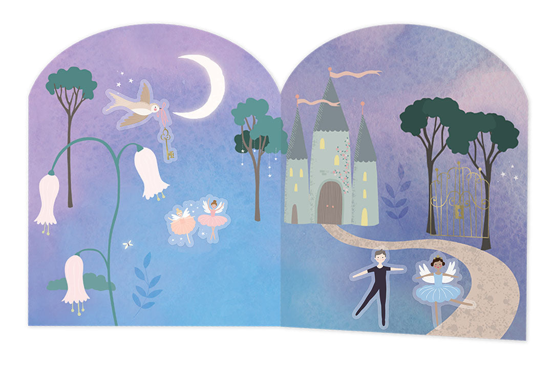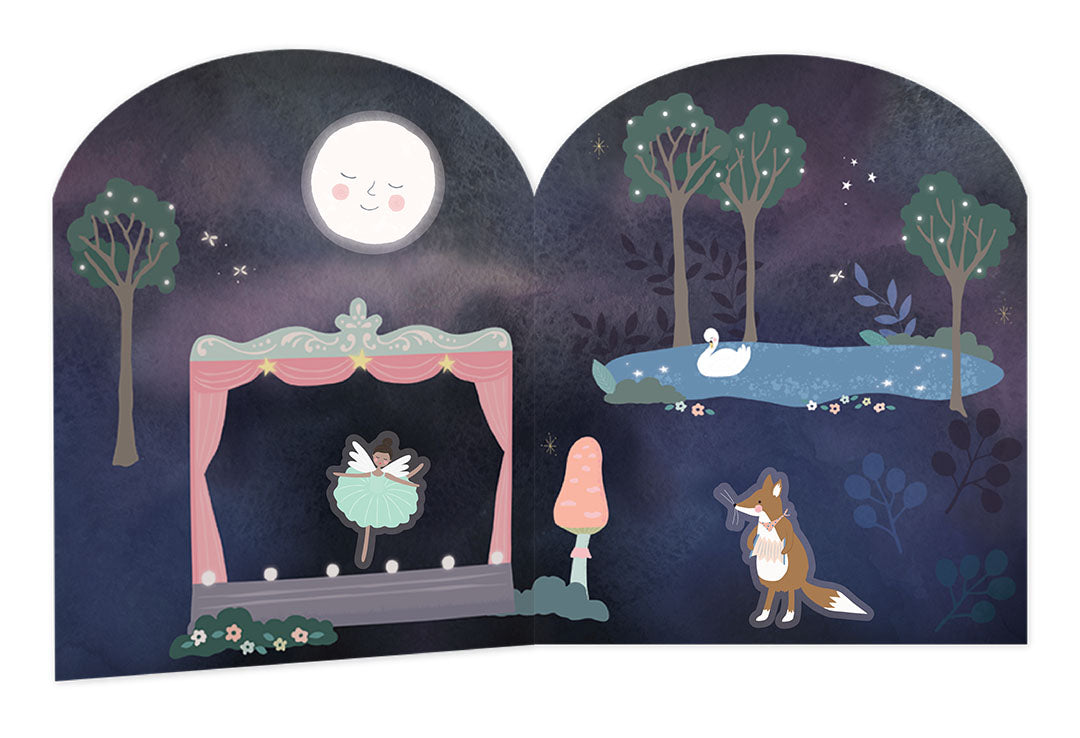 Enchanted Stick & Play book is so much fun, and educational at the same time. With over 50 fun shaped reusable stickers including Ballerina's, a smiley moon, birds, rabbits and so much more. There are 2 fold out scenes to create and make up stories using the repositionable stickers. At the back there is a seperate section where you match the stickers to their shapes. This will entertain little ones for hours! The hard back book folds completely flat making it perfect for travel and taking out and about.