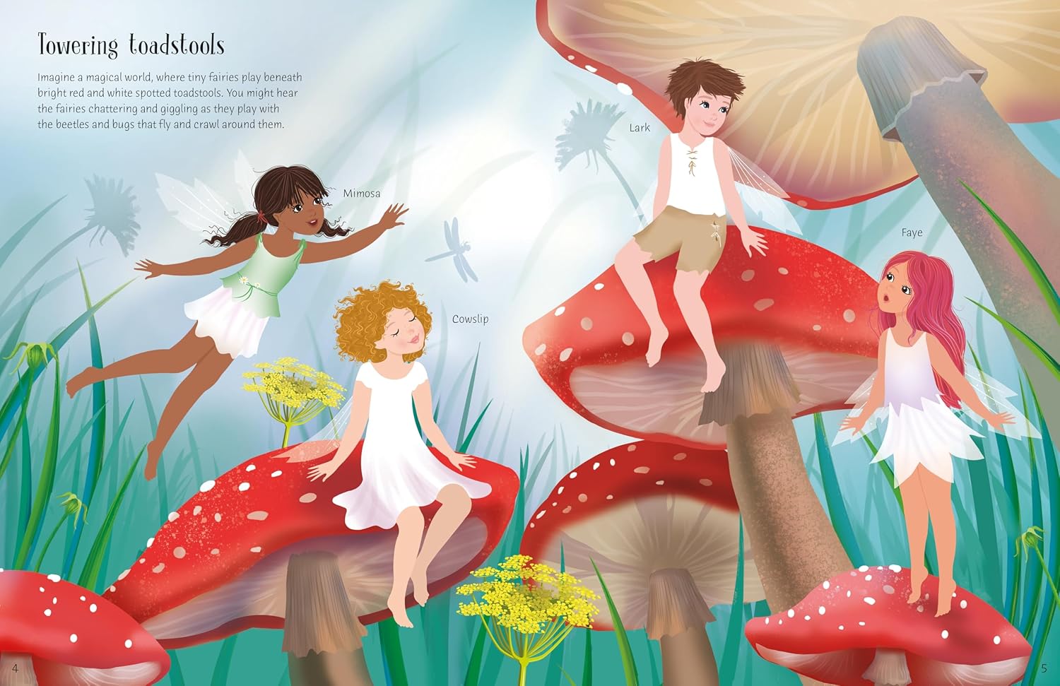 Enter the magical kingdom where fairies fly with dragons through a rainbow sky, mermaids and seals explore an underwater palace, pixies dance in a towering toadstool town and elves creep through a forgotten forest. Use the stickers to dress the dolls and decorate the fantastic scenes.